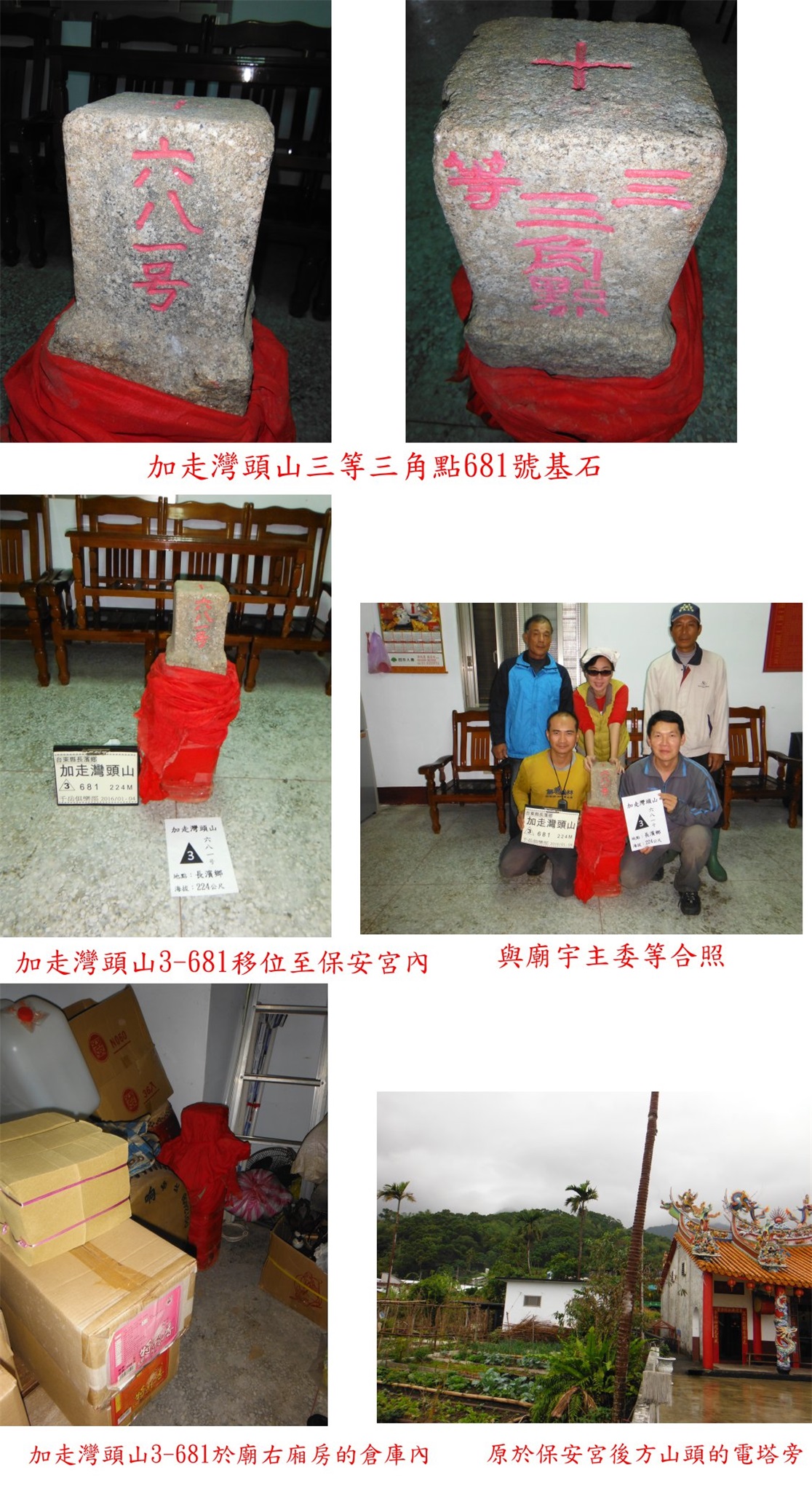 此時保安宮空無一人,廂房與辦公室均上鎖,詢問當地居民熱心的找到廟宇主委來開門;加走灣頭山3-681於廟宇右側廂房的倉庫內,基石包有紅彩,搬出拍照,此點7年前曾來過;此基石原在廟宇後方距離約