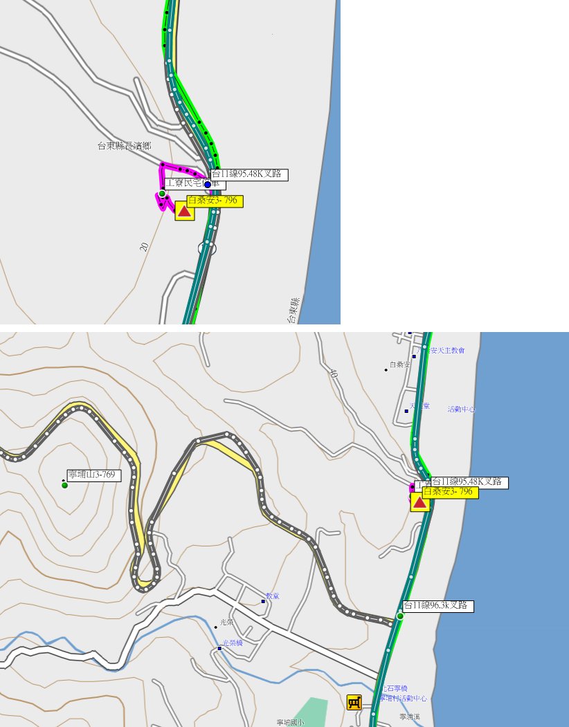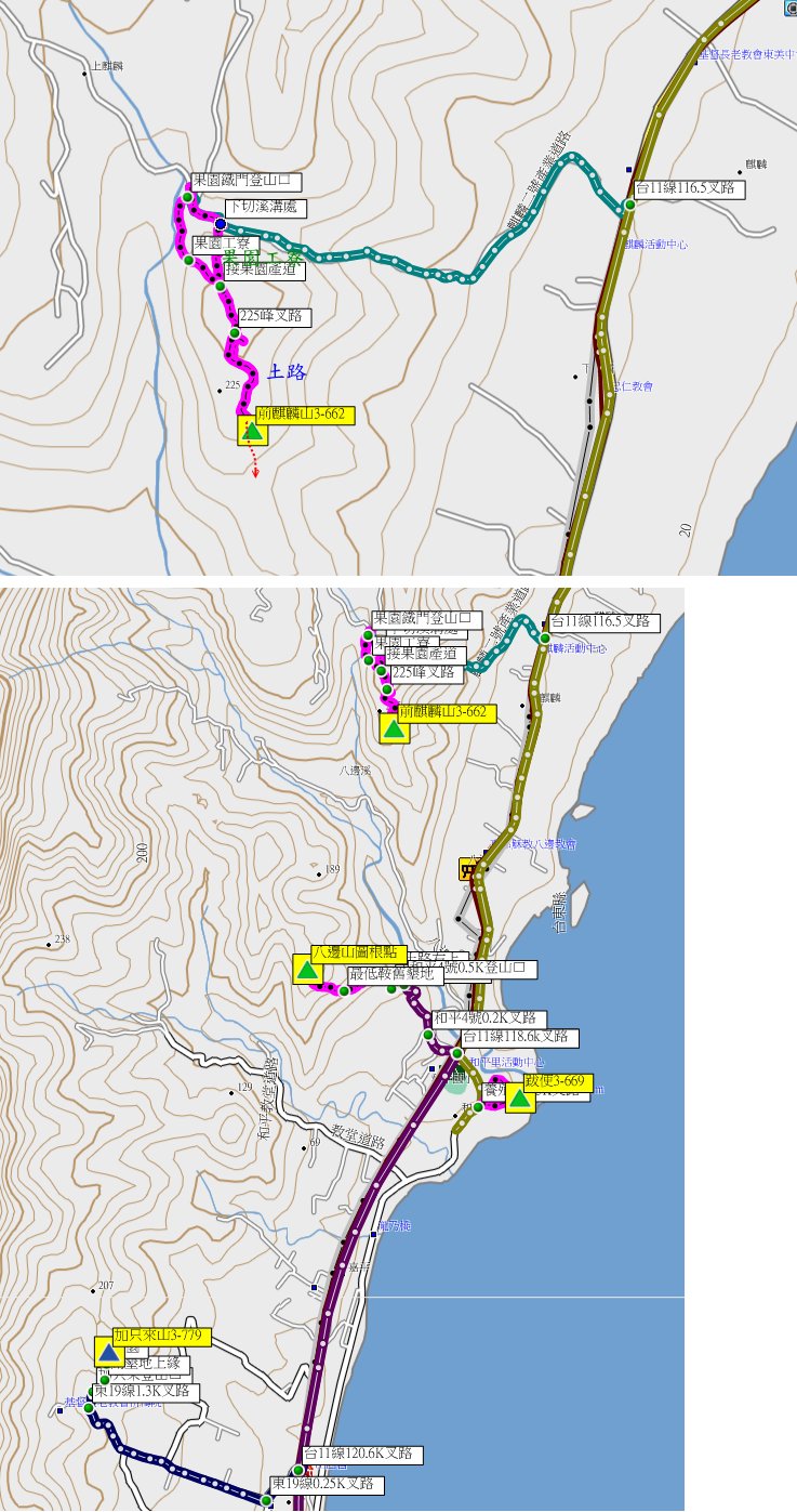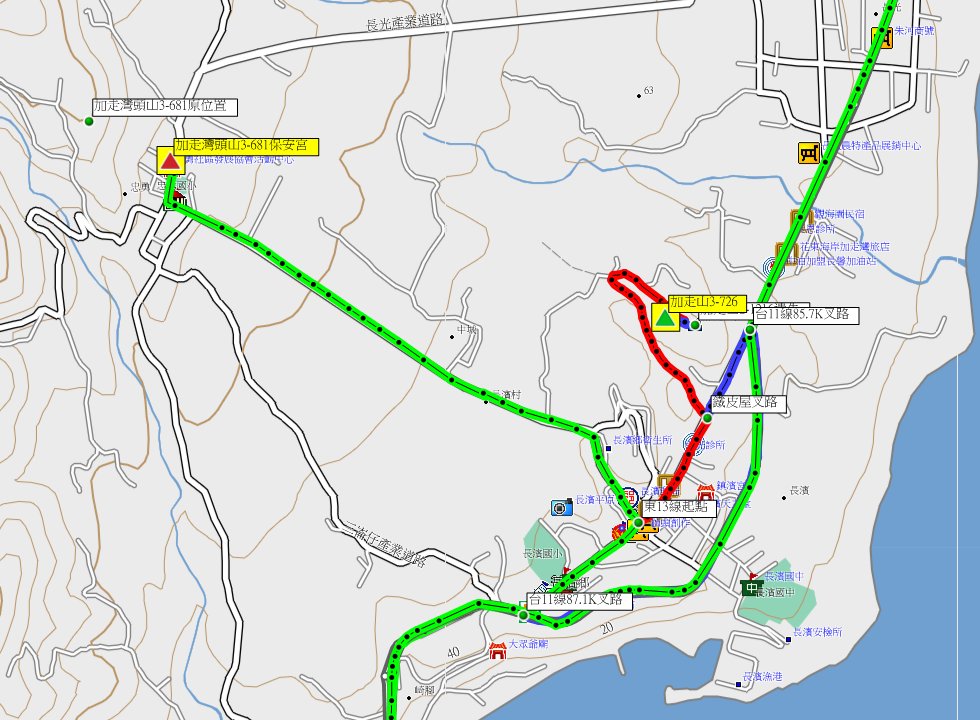 由加走山回至長濱聚落,左轉長濱路走0.3K至台11線85.7K叉路,右轉台11線續至南行95.48K叉路,右轉小路走