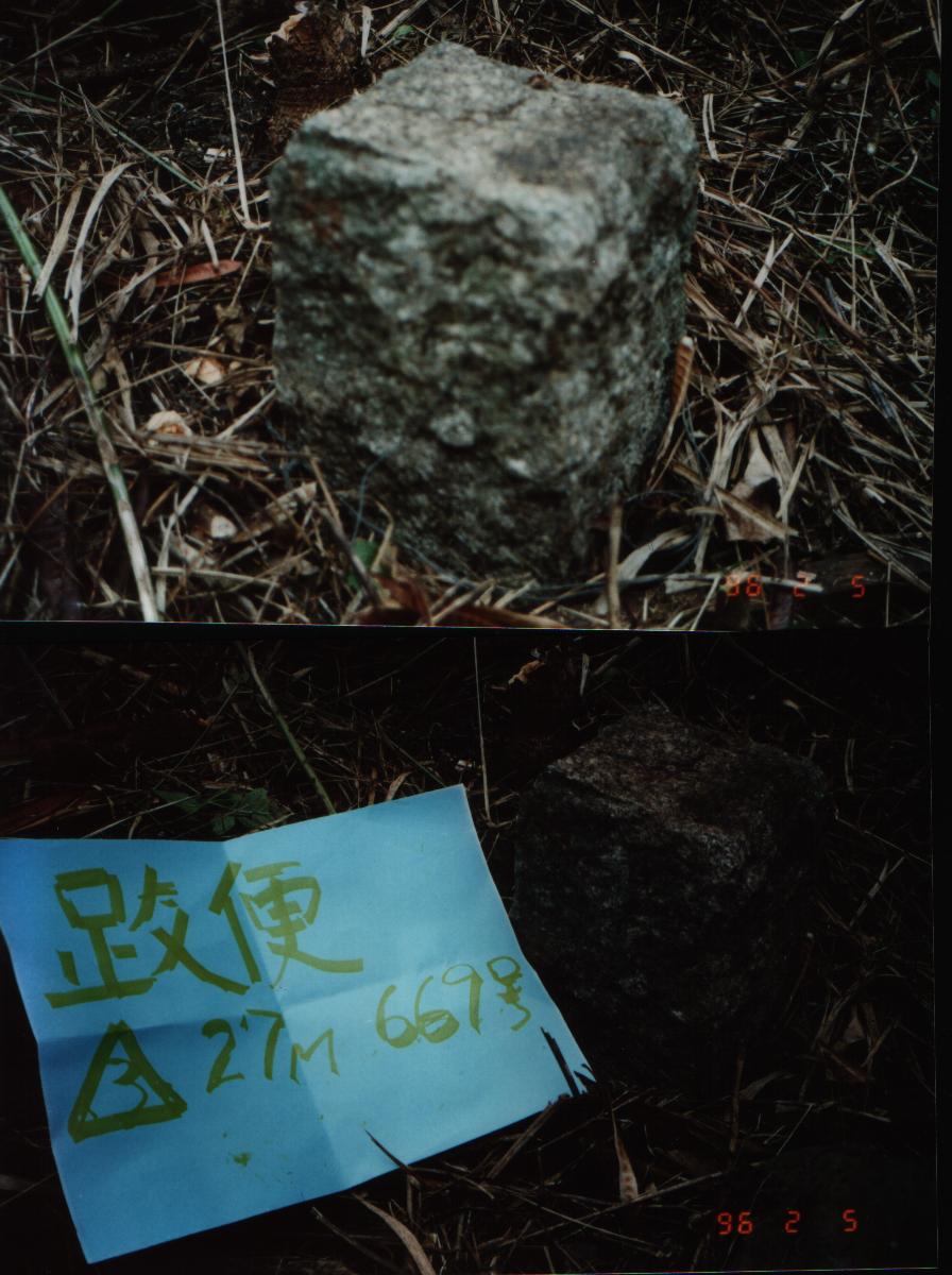 不管它!把基石上的覆土清了一下,心中已經有了答案。果不然,這顆斷頭基石真的是一顆森林三角點。雖然未見斷掉的部分,但是留下的遺體卻說明了這個事實(見所附照片):此基石邊長確為14cm,而它的斷面上,還留有一個基石的方形痕跡。這個痕跡的邊長,經過我們的測量是12cm,這也就是森林點基石的邊長!