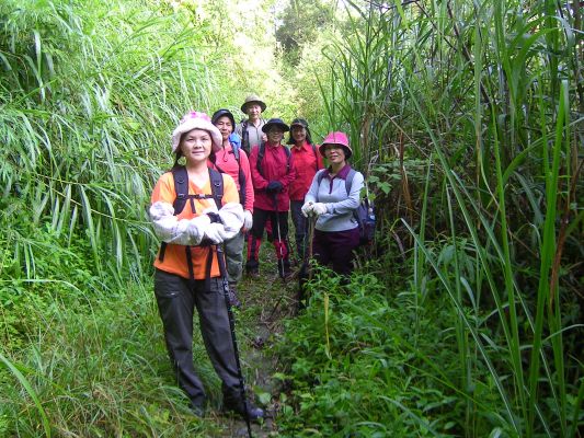 回程本想左上鹿屈山越嶺來個0行走,甩掉惱人的芒草林道,後考量路況不明雨又間歇性的下著,乖乖原路回,下克難坡10K林道後雨勢越來越大,還打雷閃電的好怕被擊中!林道已成水道走來更加吃力,顧手又要顧腳還要顧臉(謝大哥滿臉滿手多是芒草刮痕,換車忘了拿手套的後果),回至登山口4點45分5點全員到齊,結束今日行程,雨仍持續下著。