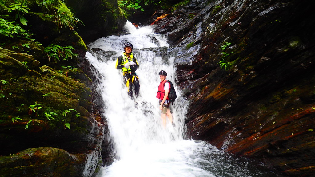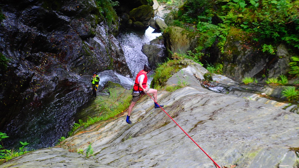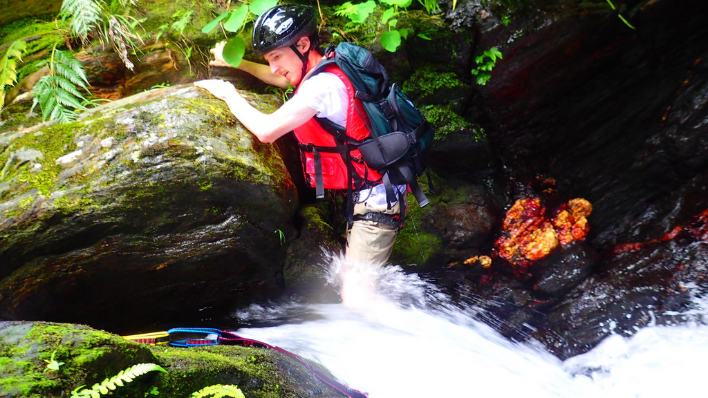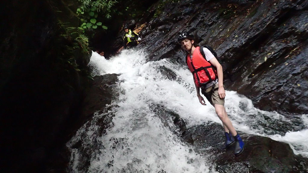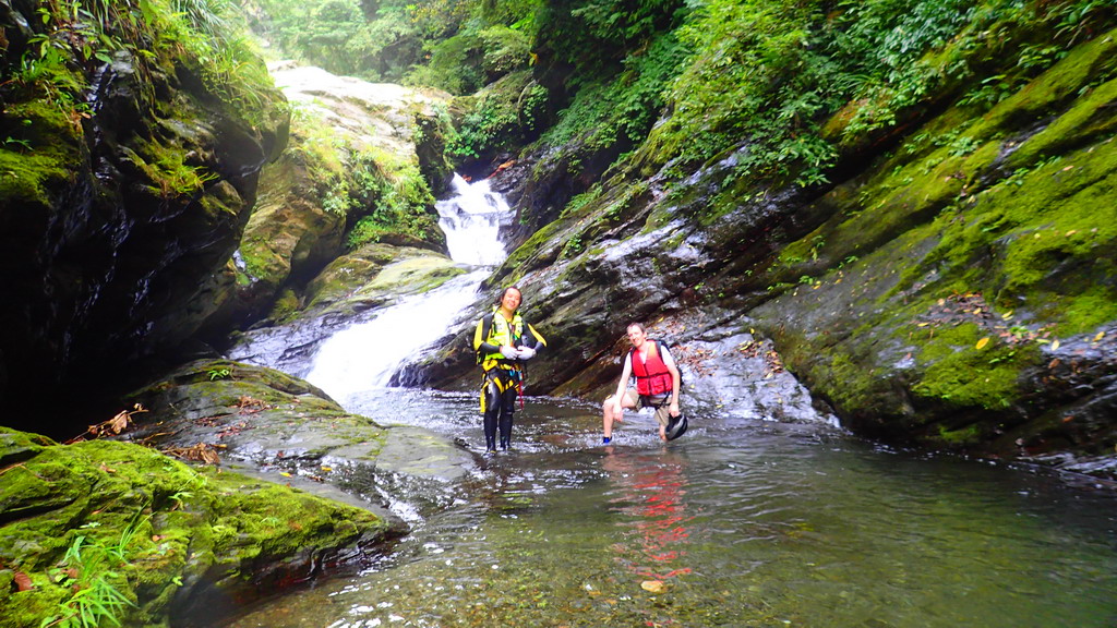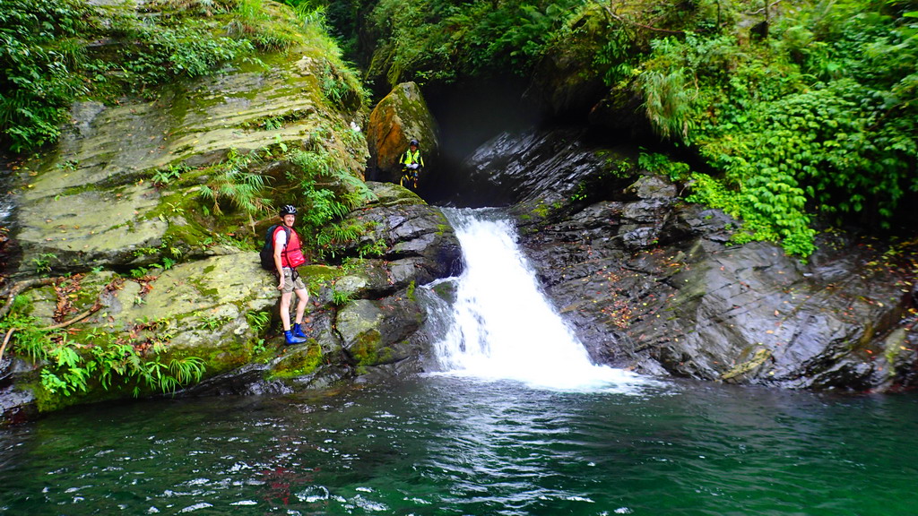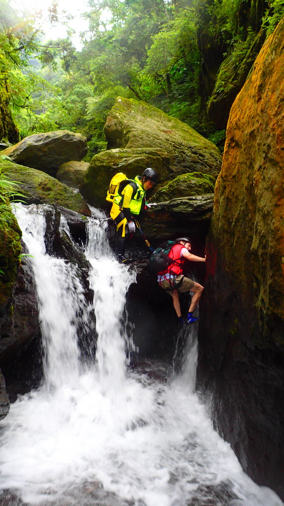 高繞完到上游的第一個深潭 , 滑瀑略左攀爬上去 . 再拐個角攀爬上去