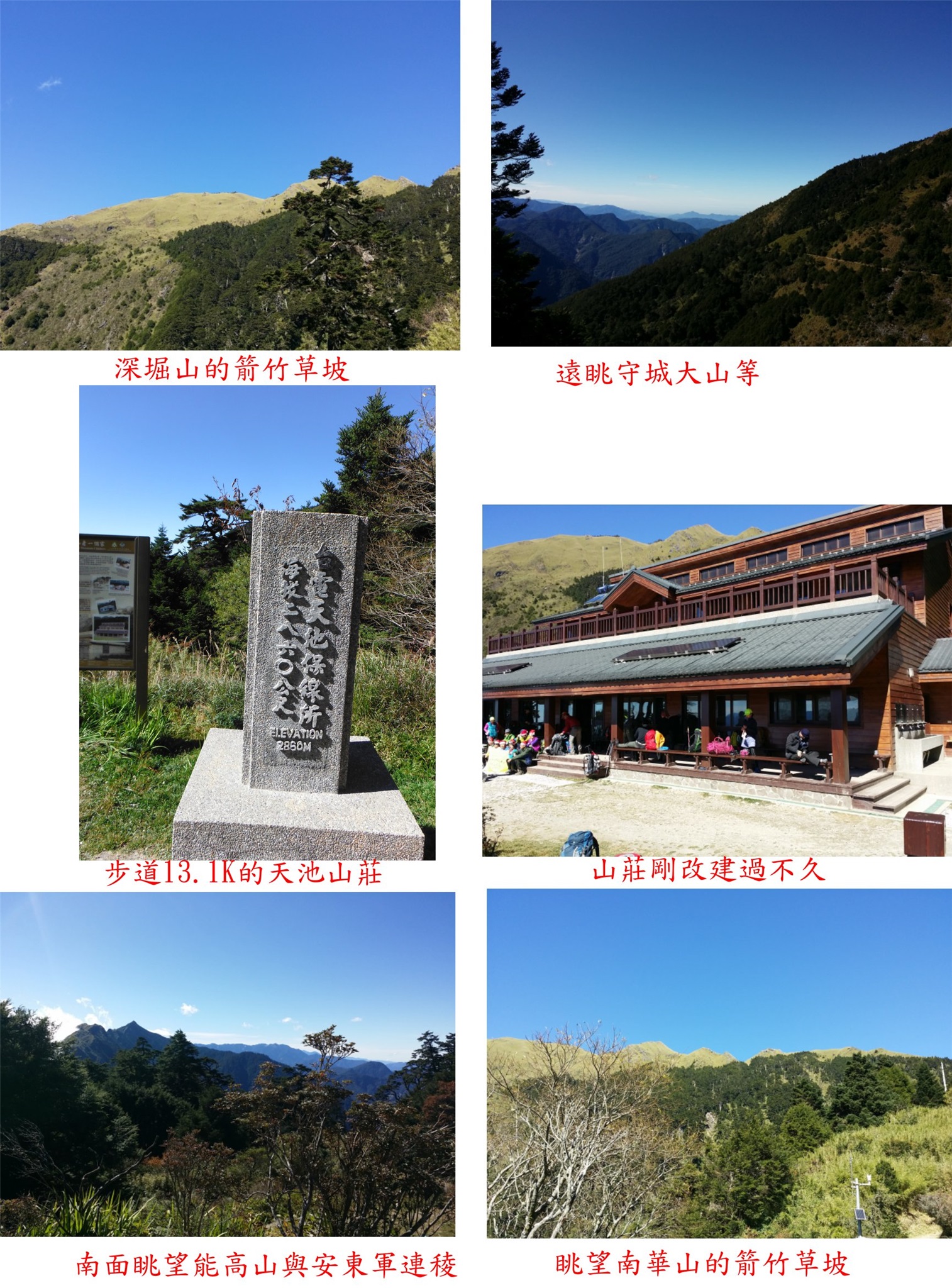 11:18△能高駐在所,一等水準點10120號,標高2860公尺,此點40年前學生時代就曾來過、只是當時不知此是什麼東東?此次是第3度造訪;基石於步道13.1K的天池山莊的廁所旁,山莊剛改建過不久,古道續行往光被八表碑等,北面眺望深堀山的箭竹草原,東面為南華山,南面眺望能高山連稜;能高越嶺步道為熱門的登山路線,住宿的山有好熱鬧,於此午餐。