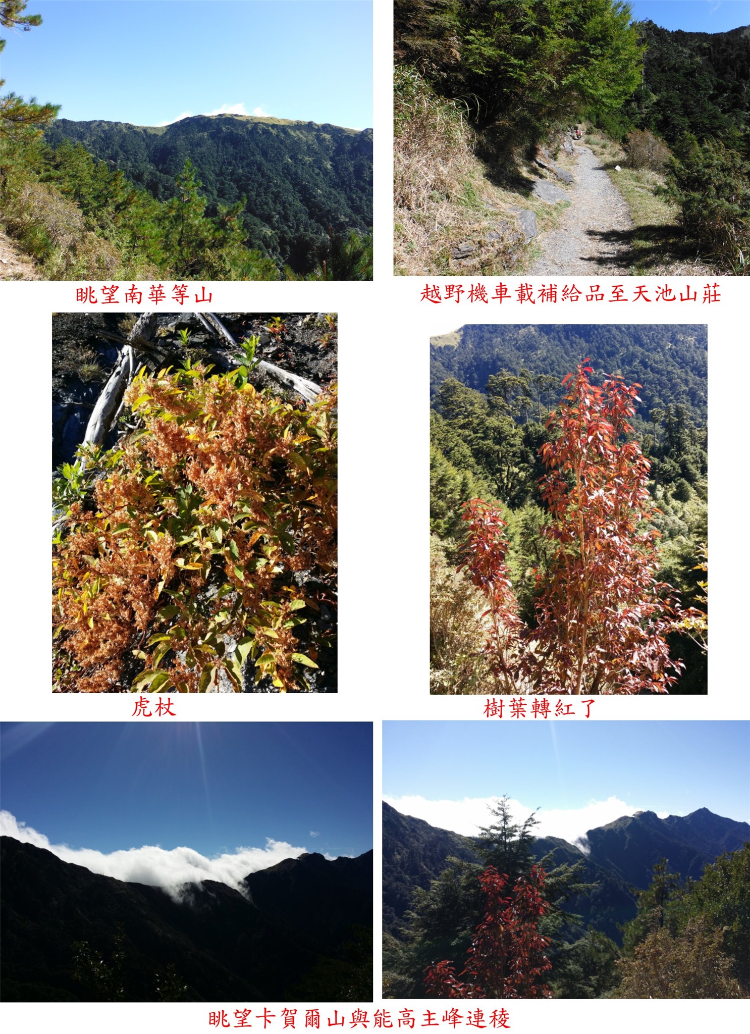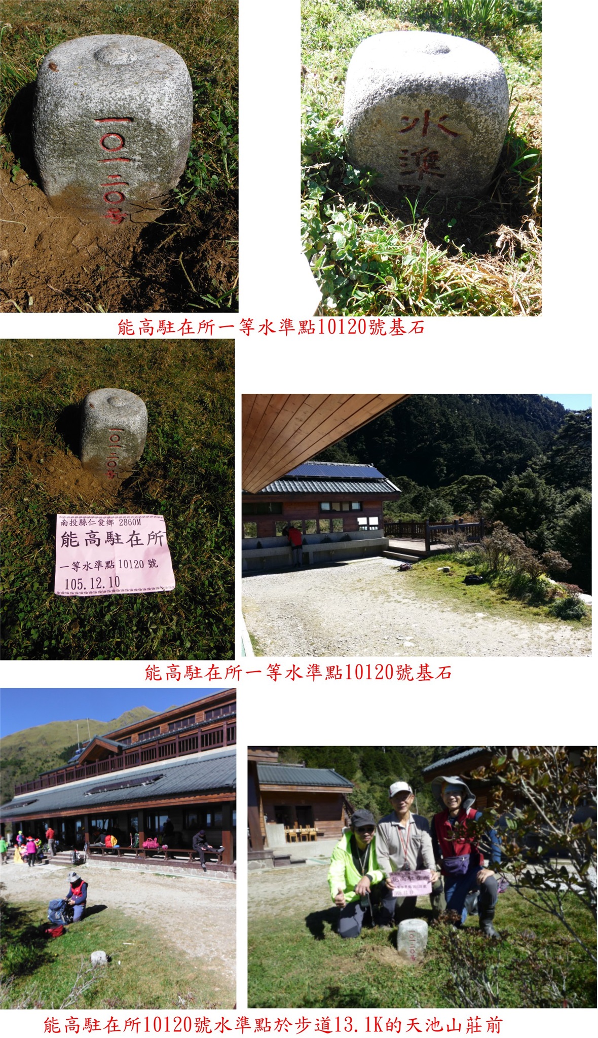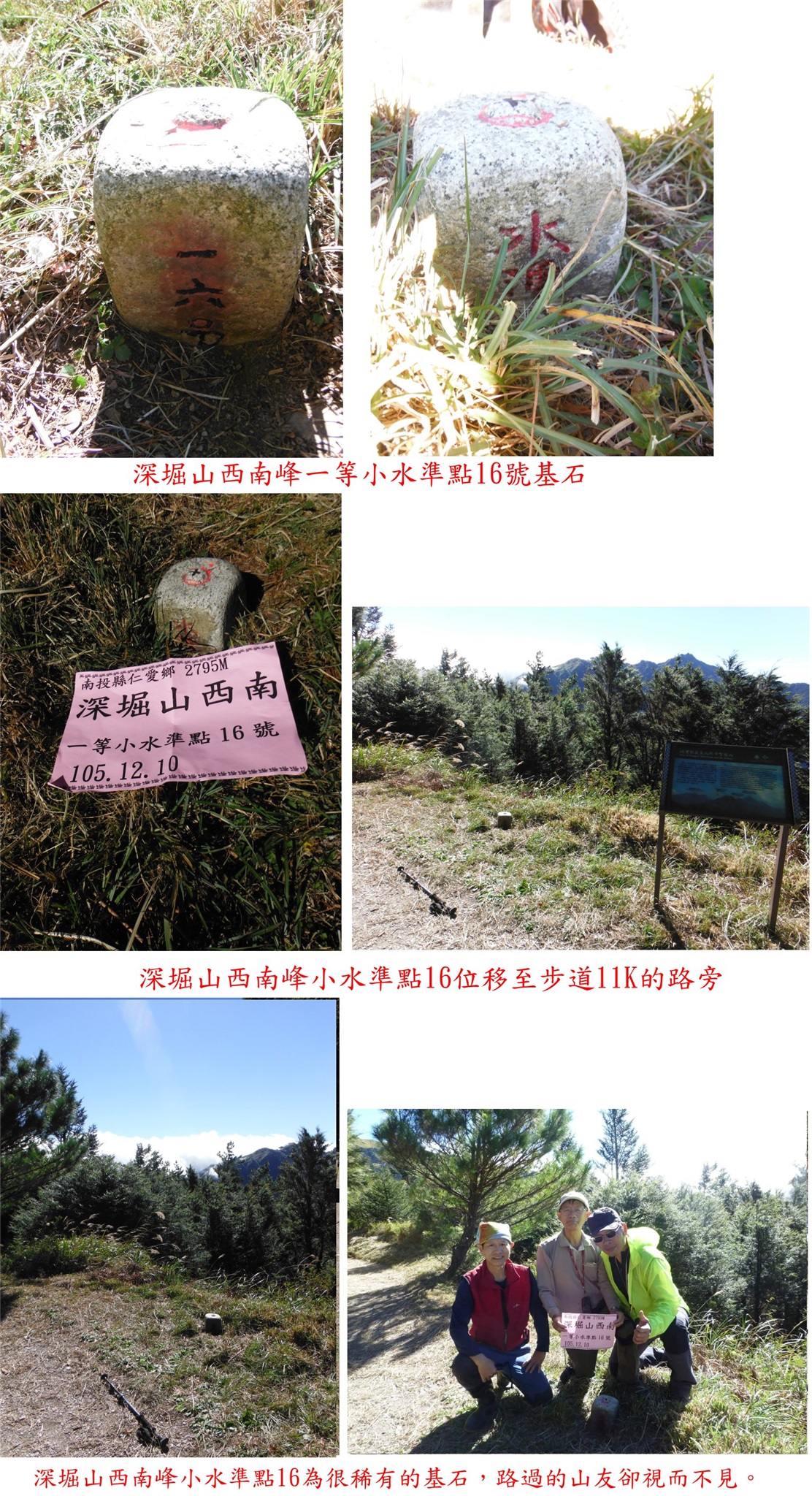 12/09-12/10約山友去南投仁愛鄉爬山,第二天(12/10)去走能高越嶺西段旁的深堀山西南峰小水準點16號與能高駐在所10120號水準點;此行由屯原登山口出發走能高越嶺步道往天池山莊,走3小時又43分鐘抵達步道10.8K的深堀山西南峰小水準點16所在,竟然找不到基石?續前行至步道11K於路旁見到此點,基石已位移;走步道續行至步道13.1K的天池山莊,見到能高駐在所10120號水準點,此點係第3度造訪;此行路程往返為26.2K,步道平緩天氣又好,走來非常舒適,並不覺得辛苦;上山走4小時又44分鐘,下山走3小時又28分鐘,含休息往返費時8小時又42分鐘。