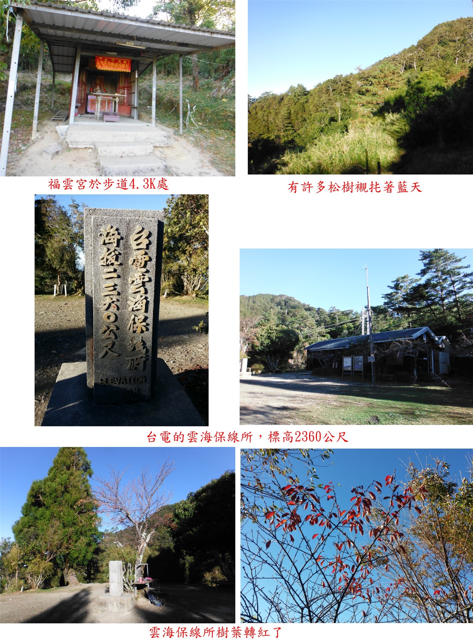 07:53台電的雲海保線所,標高2360公尺,有許多松樹襯扥著藍天,於此休息,眺望尾上山,一路山友絡繹不絕。