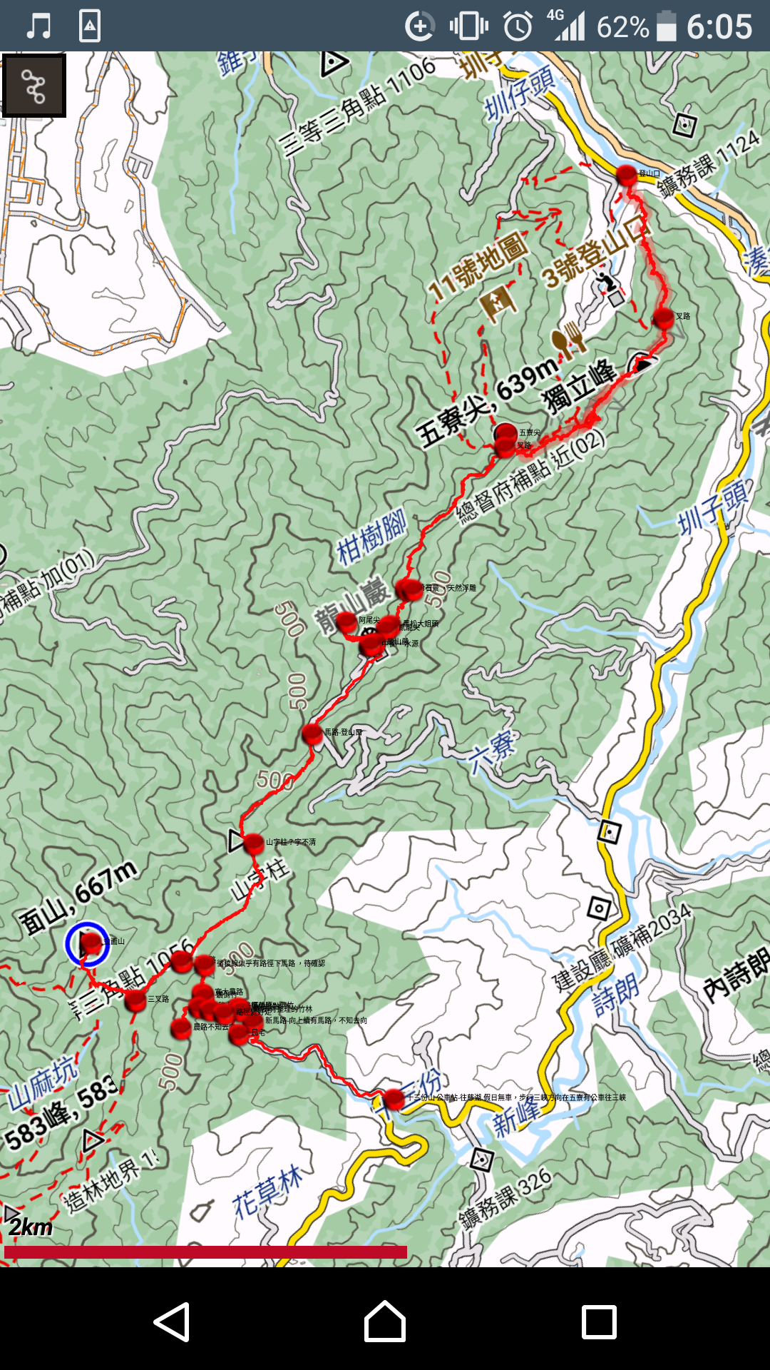 :38 台七乙3.4K玉里登山口-->10:20 五寮尖-->11:42 龍山巖-->午餐.水源-->14:30金面山-->折返-->14:50稜線岔路-->15:36 下台七乙10.3K-->步行20分後搭上善心人士便車-->台七乙3.4K登山口停車處