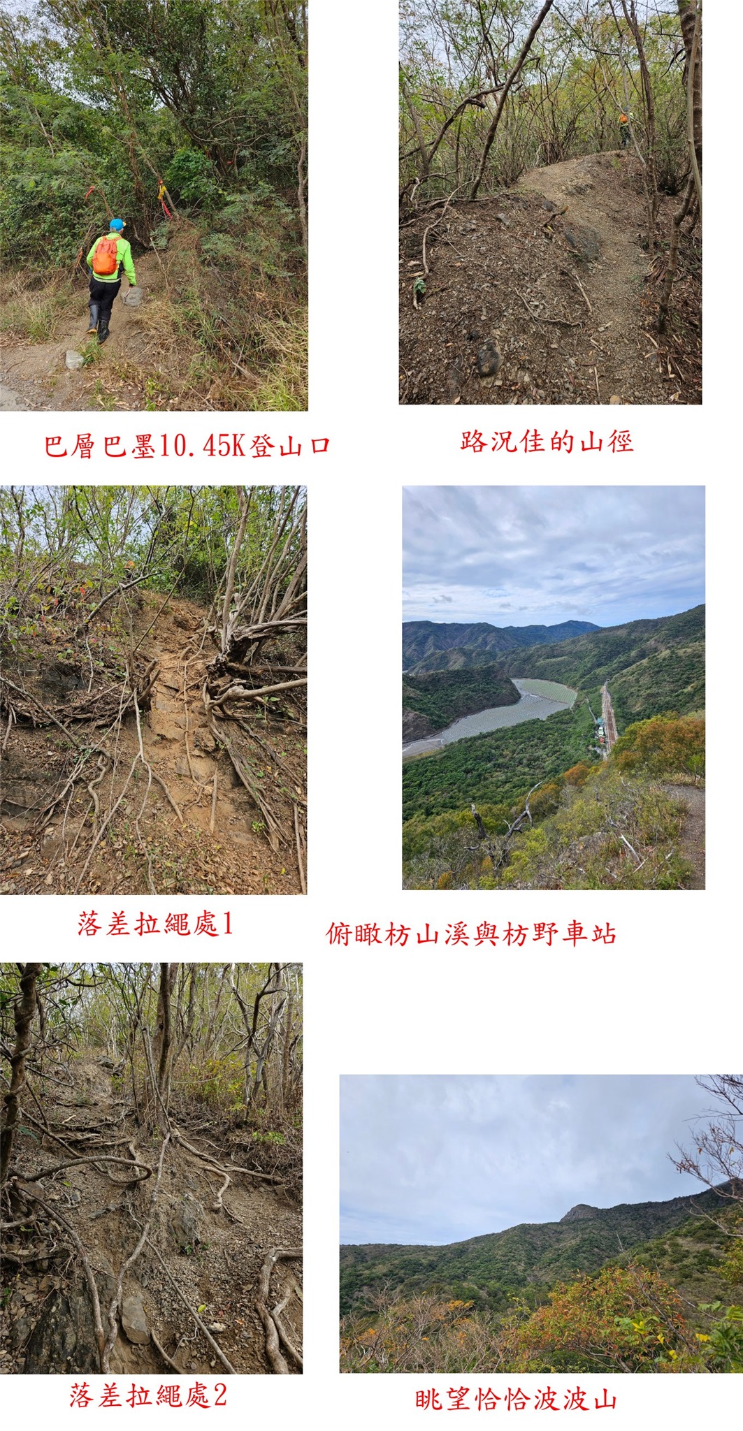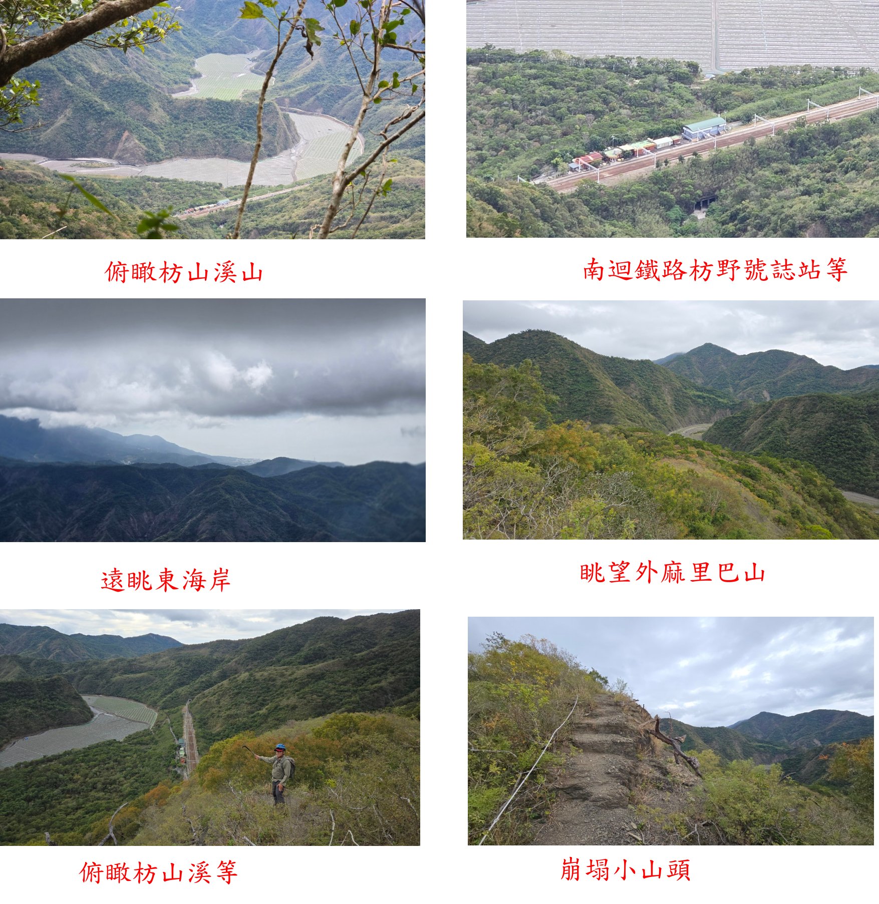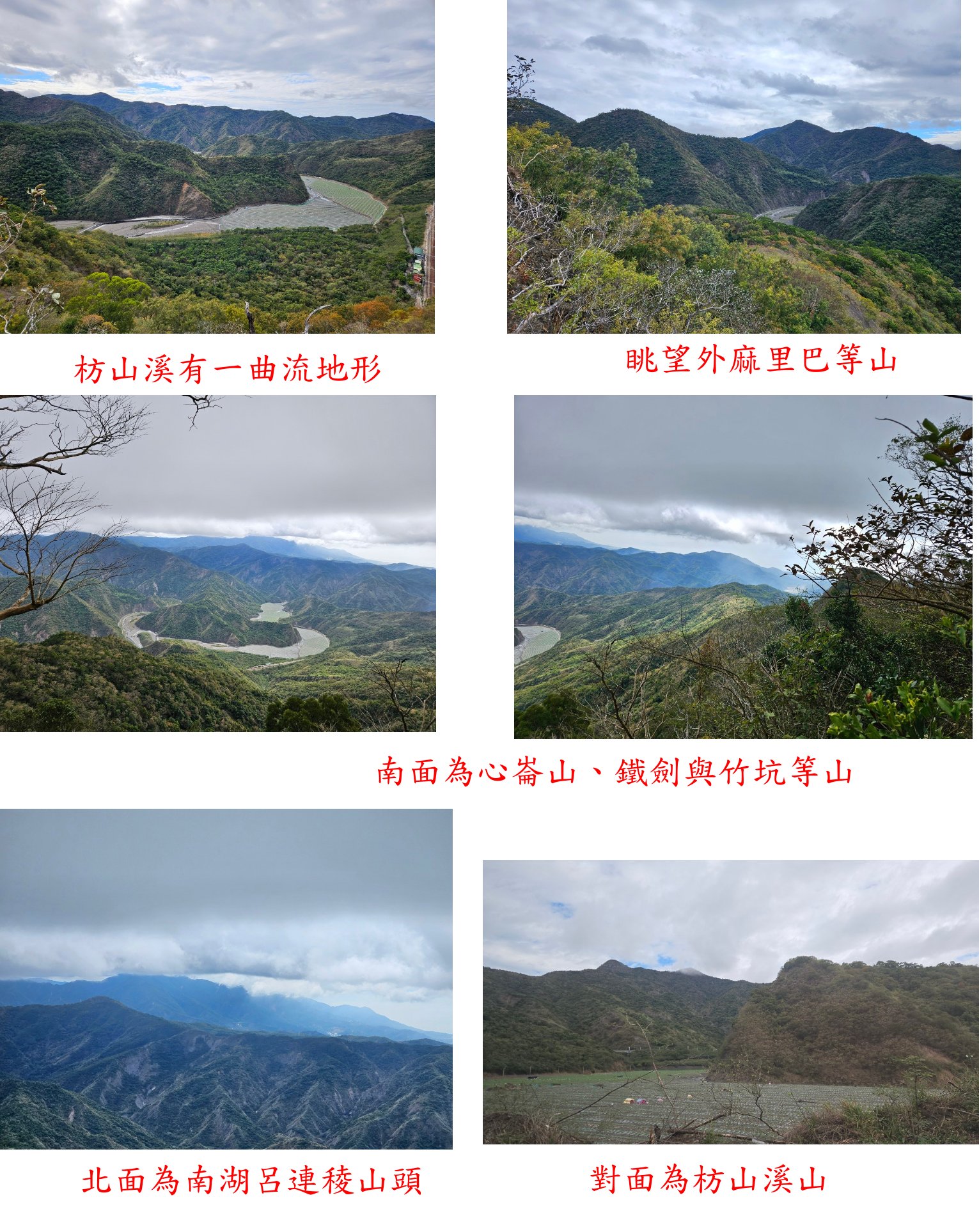 10:41右上繞崩壁區,山徑順著崖邊走,展望佳,下方的枋山溪有一曲流地形,圍繞著曾去過的枋山溪山森林三角點,西南面為竹坑等山。