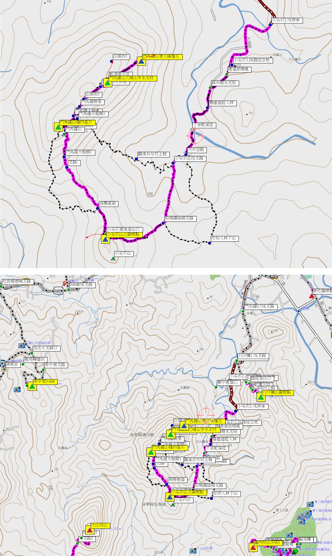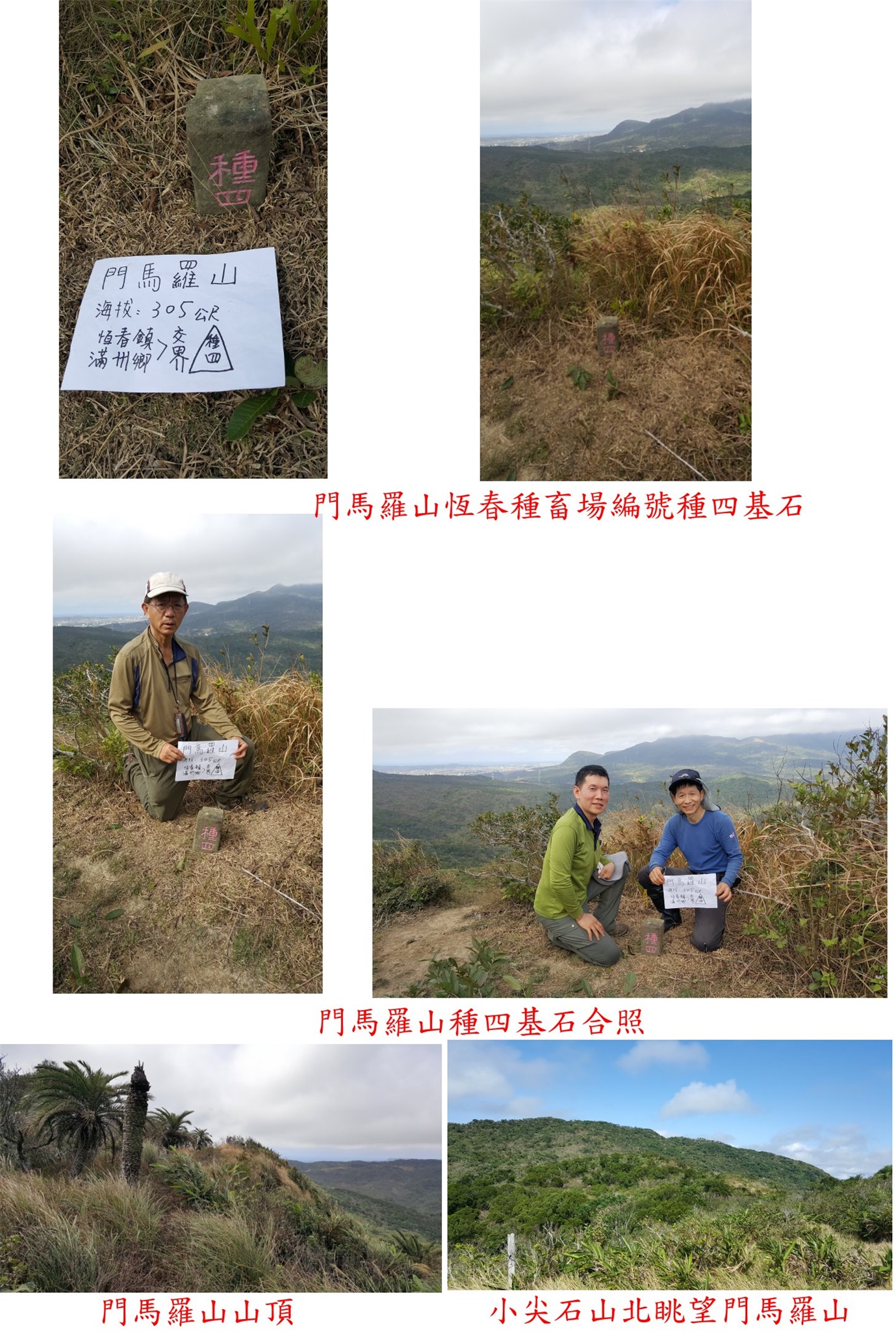 第2座轉戰小尖石山北圖根點,此山區屬保護區範圍路條少之又少要小心找路,圖根點於小尖石山的北麓,上山走約1小時;再來臨時追加門馬羅山,此山是台語摸沒路的音譯,路真的很難找,由小尖石山北過去走40分鐘登頂,原有森林點已遺失,有顆日據時期恆春種畜場編號種四基石;再來順稜去走門馬羅山東北峰,走了半小時抵達稍低處的東北峰,有顆種五基石;往回走時於稜線的草原找到一顆山字水泥柱,命名為門馬羅山北峰,意外的收穫;回程與王哥想走捷徑回停車處,真的是名符其實的摸沒路,找不路下切只好乖乖地遠繞原路回,全程往返走5小時又11分鐘。