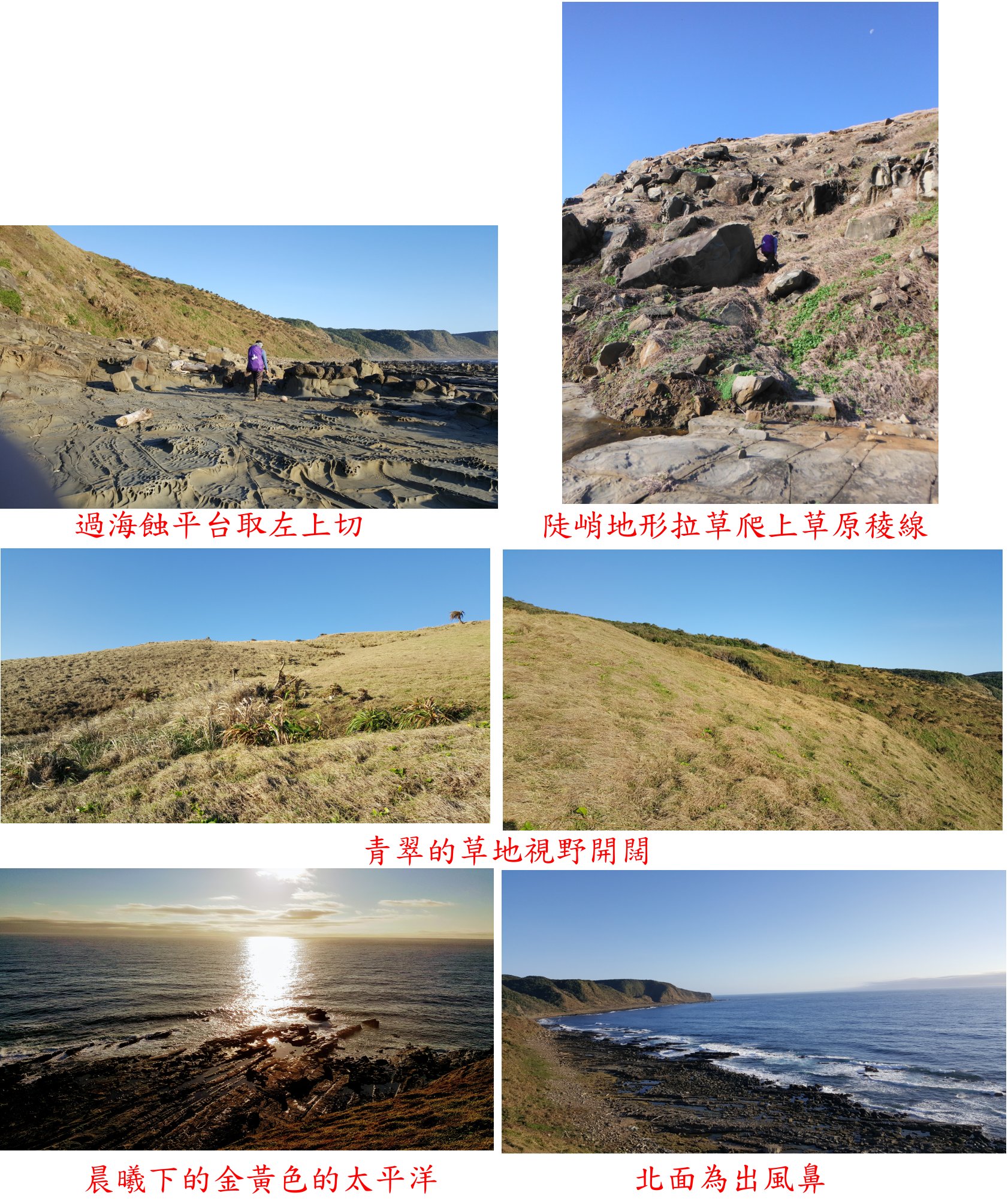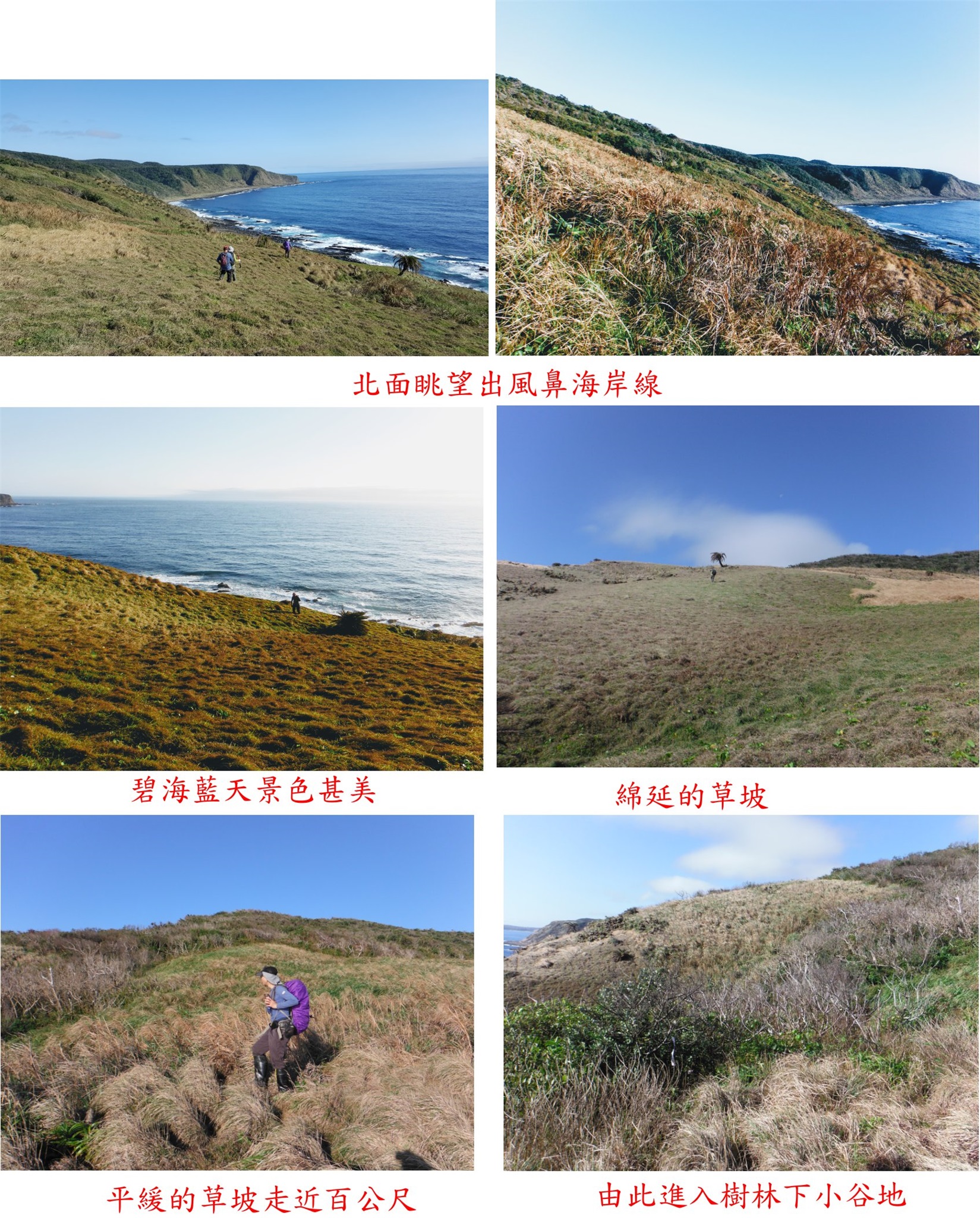 07:33上切點,於海蝕平台的北側左上陡坡,陡峭地形拉草爬上草原稜線,青翠的草地視野開闊,綿延的海岸線,碧海藍天景色甚美;南面眺望佳樂水,北面為出風鼻,平緩的草坡走近百公尺,上方轉為芒草叢。