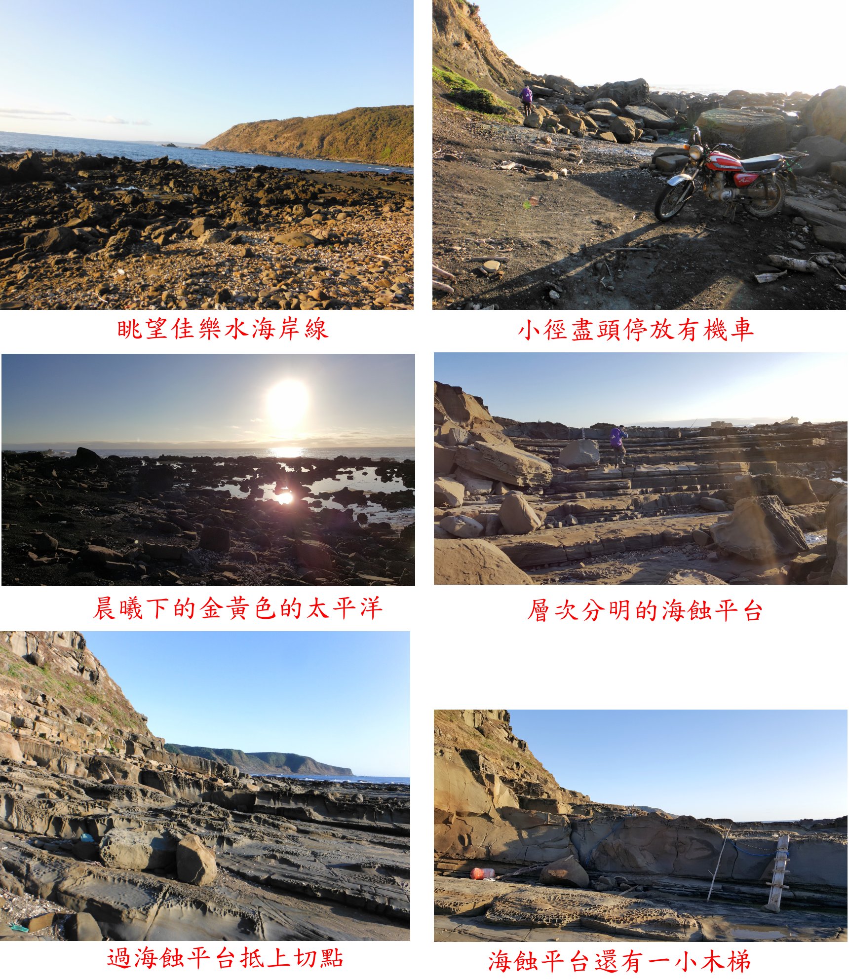 07:07出發,取左過小鐵橋,有一舊時海防部隊哨所營舍,後改為海巡署巡邏站,現已撤哨,右側海岸線往佳樂水,還可看到景區的涼亭;取左循海岸的小徑行,此段路機車可通行,海邊有多位海釣客,聽說只開放給當地人釣魚;晨曦映著大海一片金黃色景色甚佳,濱海小徑走約850公尺。