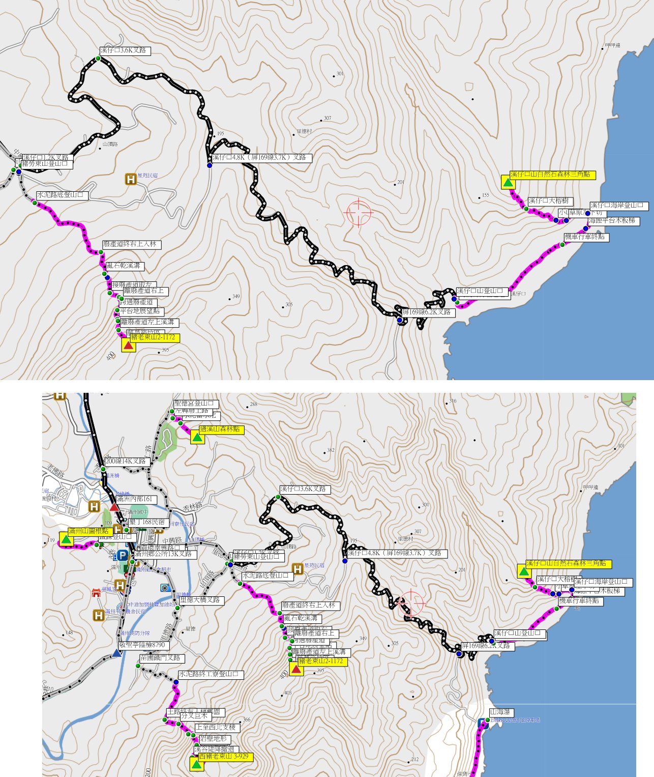 10:42永南路2.7K處停車,高61公尺,前方產道因沖刷成深溝已無法行車,電桿為「永南幹77」號。