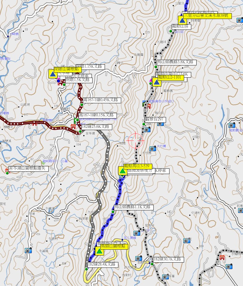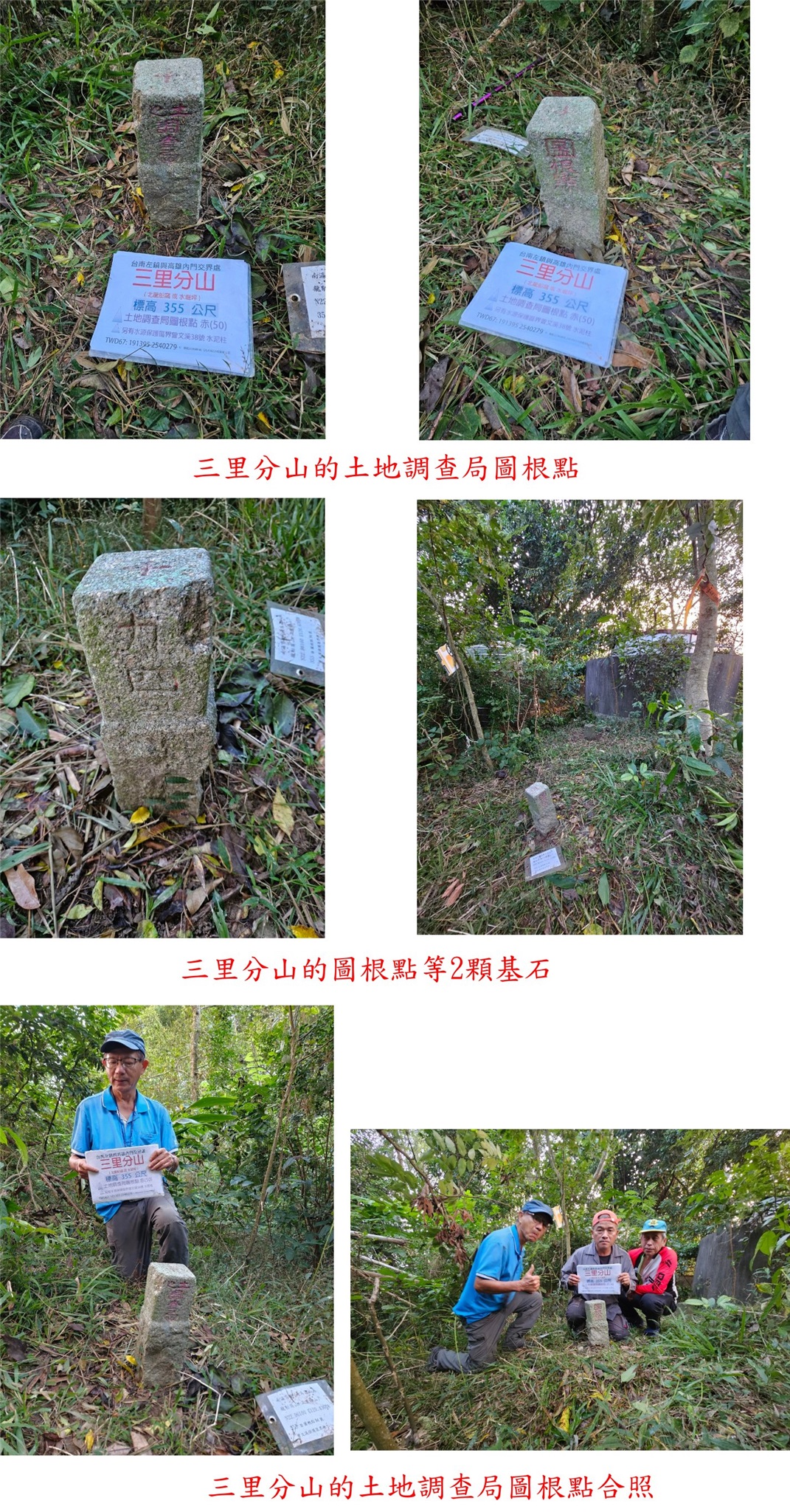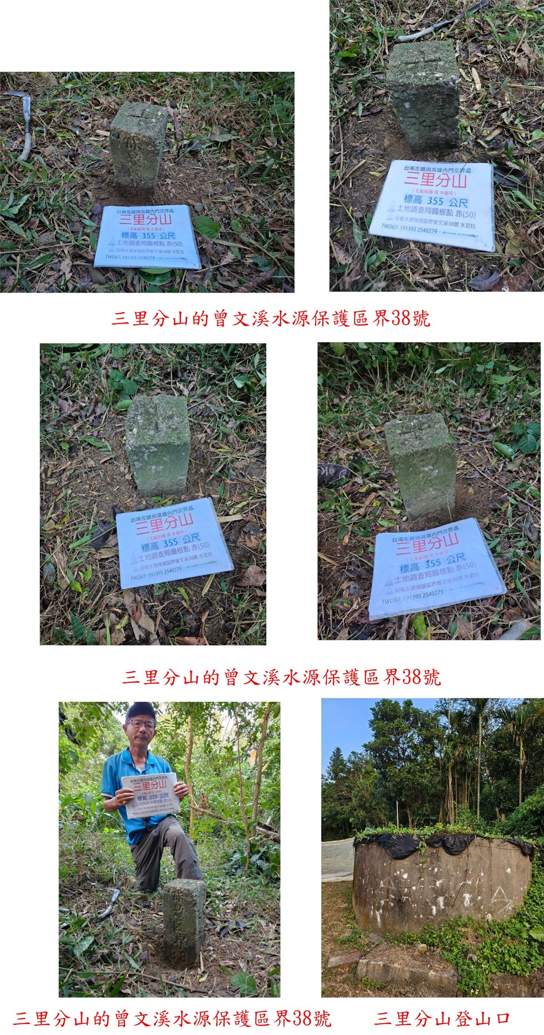 1、三里分山:又稱北龍船窩或水堀坪,位於台南左鎮與高雄內門交界處,標高355公尺,土地調查局圖根點與曾文溪水源保護區界38號等2顆基石;座標分別為191395 2540283與191395 2540281。