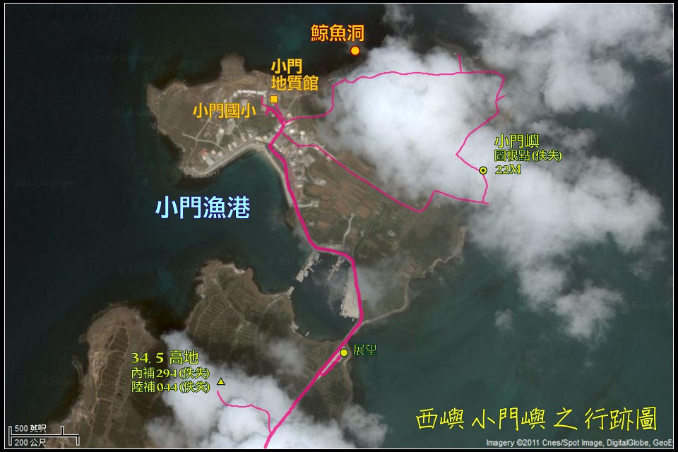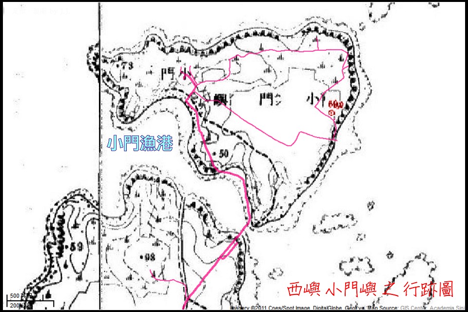 ◎ 西嶼小門嶼之行跡地圖, 底圖摘自中研院網站 http://gissrv4.sinica.edu.tw/gis/twhgis.aspx 的Google 衛星圖層.