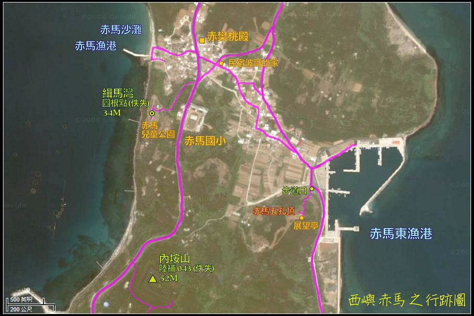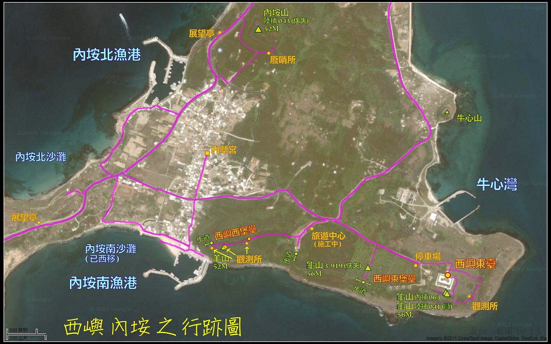 2. 因為內垵南港西側的擴建, 圖中原為沙灘的地方已經全奱成死板的港區 (紫紅色行跡是開車所經).