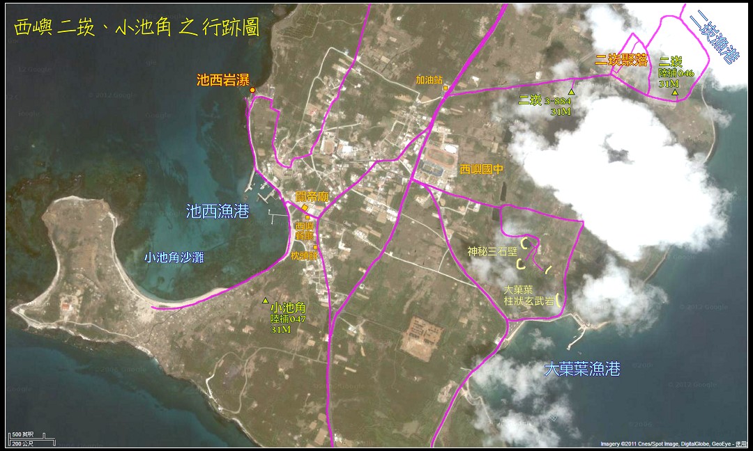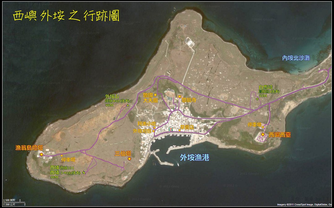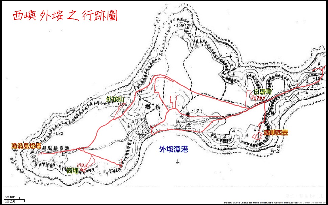 ◎ 西嶼內垵之行跡地圖, 底圖摘自中研院網站 http://gissrv4.sinica.edu.tw/gis/twhgis.aspx 的Google 衛星圖層.