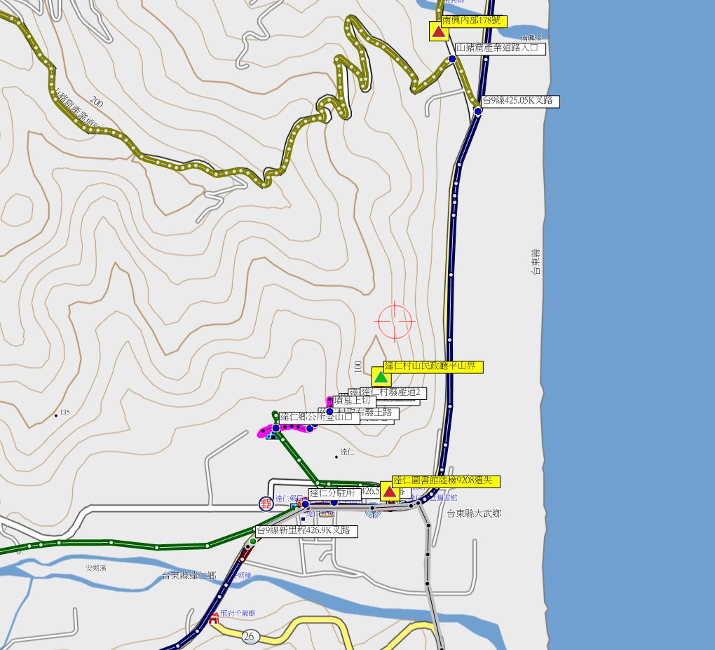 1、達仁圖書館:位於台東縣達仁鄉,標高2公尺,陸檢一等水準點9208號遺失;座標237520 2466445。