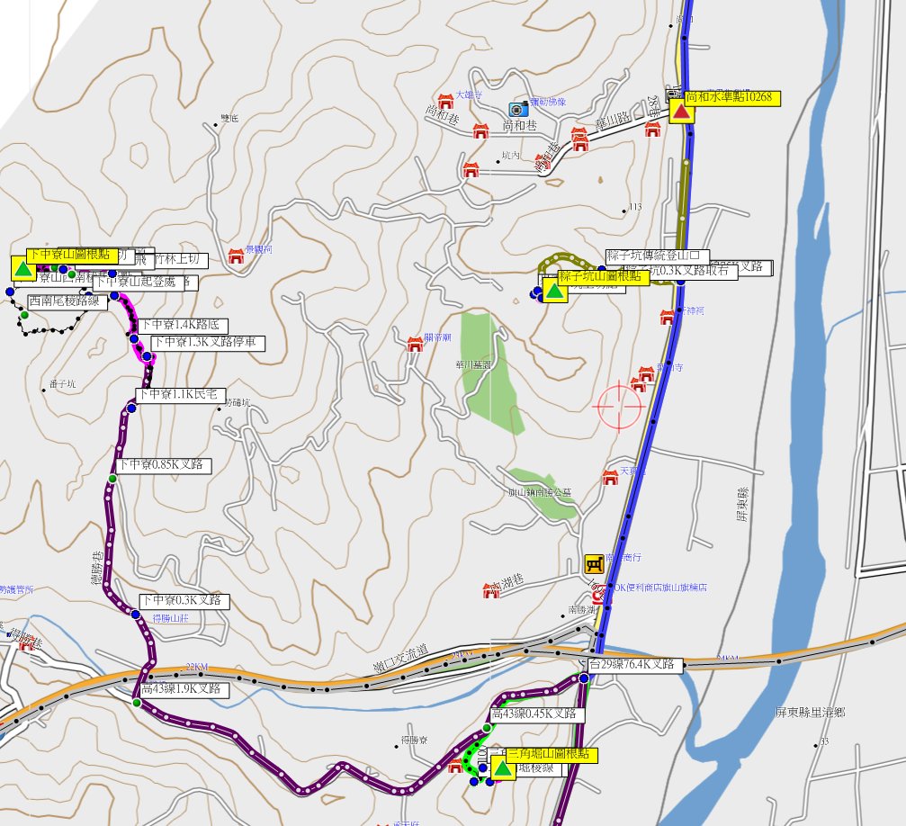 2、尚和:位於高雄市旗山區,標高46尺,聯勤測量隊一等水準點第10268號基石;座標193889 2523970。