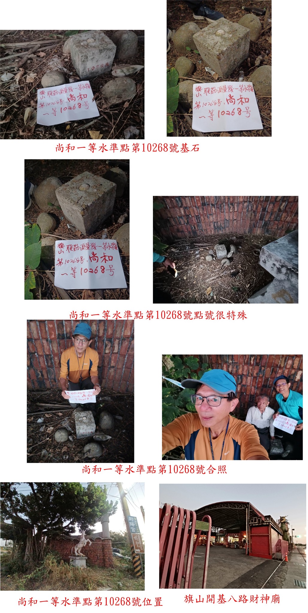 旗南三路與華川路三叉路口,於華川路南側與旗南三路夾角叉路,路旁有一座白馬雕像,後方有道紅磚牆;於白馬雕像後方與紅磚牆間,見到尚和的一等水準點10268號基石,聯勤測量隊設立於民國74年(或是71年)7月;此點外表與聯勤測量隊設立的陸檢無差異,但號碼超奇怪,號碼通常為4位數,前2位數為設立民國的年份,但此點的號碼卻是日治時代留存的號碼,原因不詳?個人猜測此點係替代日治時代的舊點。