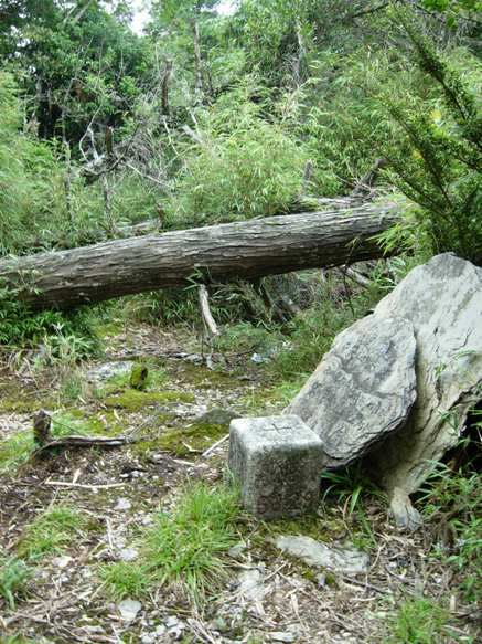 09:27退回瞭望台前方不遠處,決定先穿上雨褲,罩上雨套,取右進入柵欄叉路。一開始步道寬闊,以為好走,但還是要鑽樹洞、通過泥濘路。才幾分鐘左轉續行後,就開始無止盡的箭竹林尋尋覓覓之旅。一路濃密的箭竹林,其實林下都有路跡,只是寬闊原始的路段,令人不得不謹慎前進,唯恐迷失。砍路之餘,隨時注意前後方路條,被遮蔽的路條就整理一下,掉落的路條就拾起綁上,因為我們還要回來呀。小朋友經常就隱沒在箭竹林下,只見草動不見人影,讓人聯想到侏儸紀公園的迅猛龍在草叢中獵食的景象。小朋友走來雖辛苦,倒還會苦中作樂,沿途為各個重要據點取了站名,如水苔站、沼澤站、神木站、營地站等。11:10終於鑽出營地,一看資料還得再走上半小時才到。擔心午後雷陣雨,不敢稍歇,繼續鑽行箭竹林。11:47終於抵達多門山,標高2273公尺,三等三角點No.6329。去年南搜79天中央山脈大縱走的多門山等字跡,尚清楚的寫在三角點旁的一片石塊上。小朋友之前也看了好幾遍「中央山脈大縱走」節目,耳熟能詳,記得這是他們中央山脈縱走的起點(三星山、多門山),也覺得很興奮。