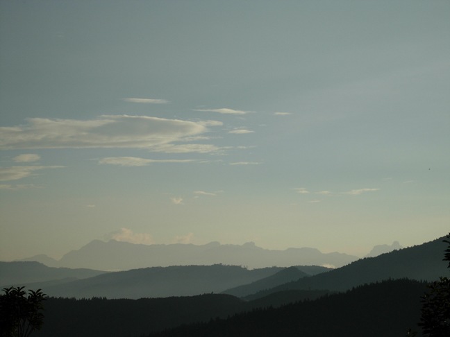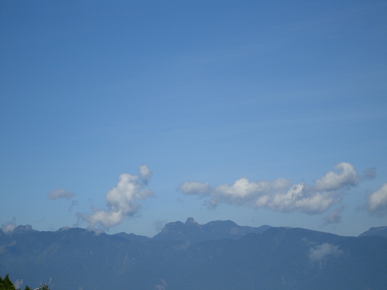 今天的目標~多門山,是太加縱走的前段,沿途據說鐵杉林、扁柏林、箭竹林參雜其中,易迷失不甚好走。但昨天忘記是在那個導覽圖看到,說明鐵杉林國家步道的終點瞭望台,展望很好,可以看到大霸、聖稜線。其實昨天在望洋山下山途中已經遠眺過雪山、品田、大霸的聖稜線,不過趁早晨天清氣爽上到瞭望台一覽群山,仍是我們遠離蹦蹦車、三疊瀑布的吸引,再度踩上僅有少數遊客才會一走的森林步道的最佳激勵因子。至於多門山,先上到瞭望台再說。在太平山莊附近欣賞過串串毛地黃、叢叢繡球花及陽光下的美麗紫槭林。也順路到蹦蹦車站,先讓小朋友看看以前爸爸媽媽坐過的蹦蹦車。08:25回到松羅館下方的步道入口,開始今天的正式行程。08:28經鎮安宮續直上。08:37抵達鐵杉林國家步道大型標示看板平台。一路至此,木階步道陡上但好走,但自平台之後步道較窄且多處泥濘,幸好我們腳穿雨鞋,一路踩踏而上,倒也無妨。09:06小兒子第一個衝向瞭望台,哇一聲後回頭告訴後面的我們,說他看到大霸尖山了~「好漂亮的風景,趕快上來!」。果然,一上到瞭望台,前方由左而右的山巒,"顆顆"鮮明,"粒粒"在目。左邊的大霸尖山仍是最醒目、最引人注意的目標了。