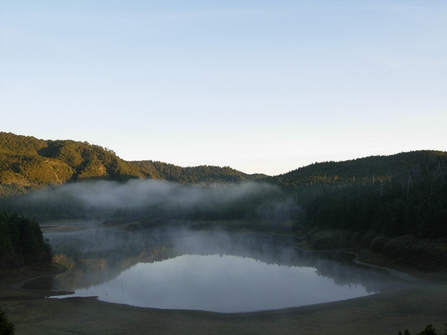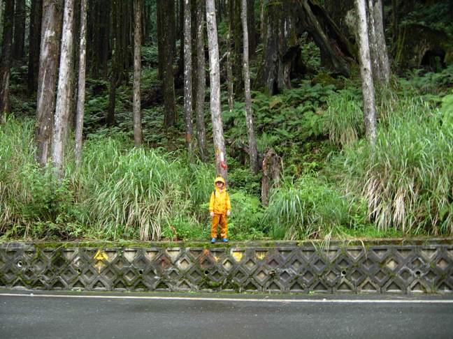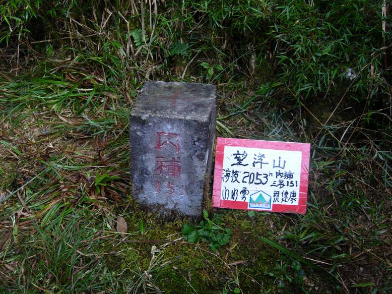 開車經林道高點續往下行,15:18抵達約16.8k處停車場,之前1.1k處有不知何時興建完成之翠峰湖環山步道西口。雨仍下著,先左入翠峰湖環山步道東口至觀湖台,欣賞台灣最大的高山湖泊、海拔1840公尺的翠峰湖。午後雷陣雨漸漸停歇,由觀湖台回到入口附近的觀日台叉路。16:00左入步道,一路陡上而行。16:09經眺望台,16:16抵叉路口,指標說明「直行650M觀日台,右行250M翠峰山莊,回150M觀湖台」。16:37抵達最高點觀日台,涼亭似乎是後來重新搭建的。此時雲開霧散,斜陽映照,美景當前,讓人忘卻一路的奔波辛勞。但目標尚未完成,已經第三次來到觀日台,再不動身,就得等第四次再來拜訪望洋山基石了。再度穿上全套雨具,因為往基石之路又是佈滿又濕又密的箭竹林。16:54往望洋山頂出發,入口在涼亭右側,正好把涼亭讓給剛上來休息的另外一家四口。在箭竹林穿梭中還聽到涼亭那位爸爸的聲音:「他們是專門來爬山的,你們看那兩個小孩子就這樣鑽進草叢了。」箭竹林又密又難鑽,全身再度搞得又濕又髒,還好不用十分鐘就登頂了。望洋山,標高2050公尺,聯勤四0一廠三等三角點內補151(民國66年3月)。山頂一片窄小空地,兩大兩小登頂,尚略感擁擠。回程五分鐘即回到觀日台,再度欣賞夕陽下的美麗山景。18:00原路下山,18:16抵叉路,改取左行。18:20由改建中的翠峰山莊右側繞過,18:30漫步回到停車處。今晚的天空,滿滿的星星。抱著兒子躺在地上仰望星空,搜尋那可以許下心願的流星,流星雖然沒有看見半顆,不過我想我們這兩天的心願應該是可以圓滿達成的。