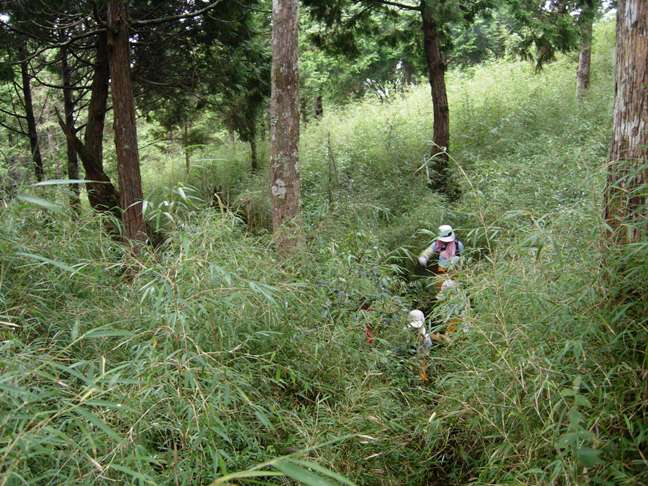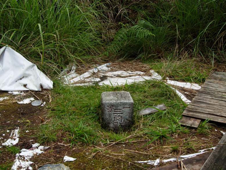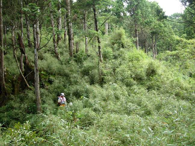 清晨六點桃園出發,循台66及二高北上,經北宜高、雪隧下宜蘭匝道。尋尋覓覓中,自出發後兩小時五十分終於接到右往大溪北橫的叉路口,續直行台七甲。經跨越佈滿西瓜的蘭陽溪上大橋~家源橋,左轉接宜專一。再四公里過舊收費站,又二公里排隊繳費七百元(假日收費:成人200元,半票100元,汽車100元),一路直上太平山。原本暑氣難耐的感覺漸漸轉為清涼舒適。10:05遇翠峰湖(左)、太平山(右)叉路口,停車辦理入山證。自家源橋至此足足又行駛有25公里之多。在熱鬧人群之中快速辦妥證件,立刻啟程循平元林道往三星山、翠峰湖方向前行。10:40於林道5.8公里左右處整裝後出發,翻上林道左側不明顯但有紅漆記號的登山口後,一路上行。途經幾處巨大檜木樹頭,又是一段讓人感慨的森林開發滄桑史的遺跡。中後段由針葉林芒草交界處,再進入芒草箭竹林交界處,潮濕難行,鑽行不易。穿上雨衣,起刀稍微砍修,才終於突破阻路密芒,上稜左轉繼續穿梭箭竹林。又七分鐘,見到芒草之中傾頹的廢棄木造瞭望台,低身越過芒草洞,於12:22抵達標高2351公尺,立有一等三角點基石及一等衛星控制點不鏽鋼立牌的三星山山頂。不料,原本已雲霧四起的山頂,不僅開始下雨且越下越大。苦等五十分,不得不放棄山頂午餐,於13:12陣雨稍歇之際,原路下山。13:27覓得一處林下空地,煮食午餐。天候不佳,不敢擔擱。14:03餐畢即刻收拾續行下山。雨依舊忽停忽下,而芒草路徑因來時鑽過一次,回程變得好鑽些了。一路只聽得後方三星山山頭附近傳來陣陣雷聲,邊走邊慶幸我們沒有如往常留在山頭逍遙。14:40回到登山口,於細雨中車行續前往翠峰湖。
