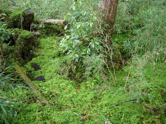 因為雲霧已起,山頂的螞蟻太多,咬人還會痛,小朋友已經被咬好幾包在喊痛了。辛苦揹上來的午餐,也只好不煮了,先吃些備用的土司等食物充饑後,又是難得不在山頂逍遙,12:10就趕緊回程了。回程時叮嚀四人要跟緊,沒跟到時要喊叫,因為箭竹林實在「多門」,容易走散。回程時因為拜來時的稍微整理過,倒是走得順利。仔細端詳這一片森林,其實景色也是非常自然、原始而美麗的。13:03通過「沼澤站」,13:09來到「水苔站」,其中一處有兩大坨動物新鮮排遺,不知是山羌還是水鹿的?會想到水鹿是因為山頂曾聽到動物叫聲,並不是如狗吠的山羌叫聲,而是類似電視中曾聽過的水鹿叫聲。但記得水鹿是在高海拔生活的,只能存疑了。13:46大兒子一時踉蹌,我說:「你腳軟啦?」小兒子精神奕奕搶著回答:「我的腳變硬了,變得很有力。」令人莞爾一笑。13:49走出柵欄,感覺重回人間。13:50回到瞭望台,而此處是早已無景可賞了。沒想到由此至多門山一個來回,竟鑽行箭竹林足足有四個小時之多,真是辛苦全家大小了,不過相信每個人都是充滿收穫的。將雨褲、雨套等髒濕衣物,暫時於平台上晾曬,坐下喘息。本來以為不會有人上來,想不到接連上來了兩三隊人馬,其中還有一個三歲小女孩,不哭不鬧、精神抖擻,很厲害。14:17下山,14:44回到鐵杉林國家步道看板平台,稍事休息。14:51改取右續下,仍為高級木階步道。15:03經松羅館接回早上步道入口。到現在為止,令人擔心的雷陣雨,幸好一直沒來。