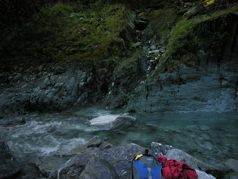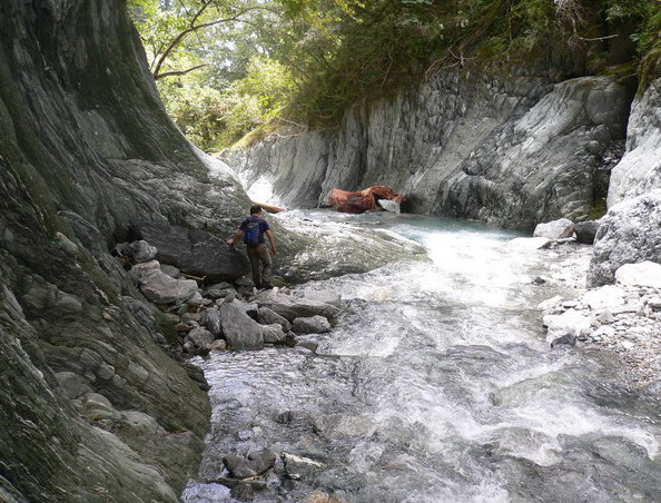 間去探上切袋角的攀登點,沿溪往上游走四五十米距離,發現一溪溝,溪溝攀登都沒有