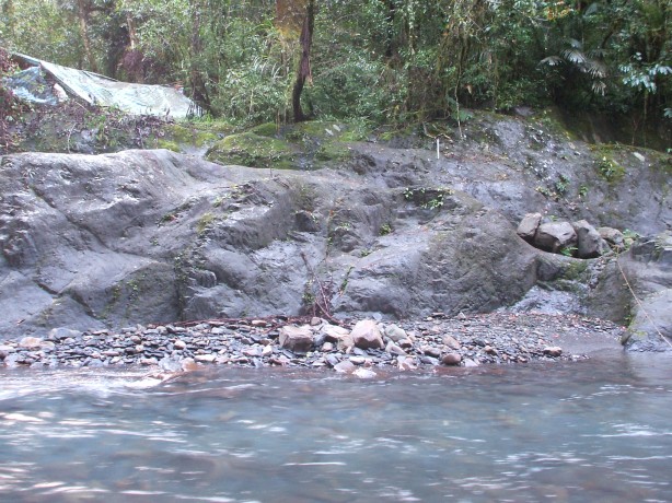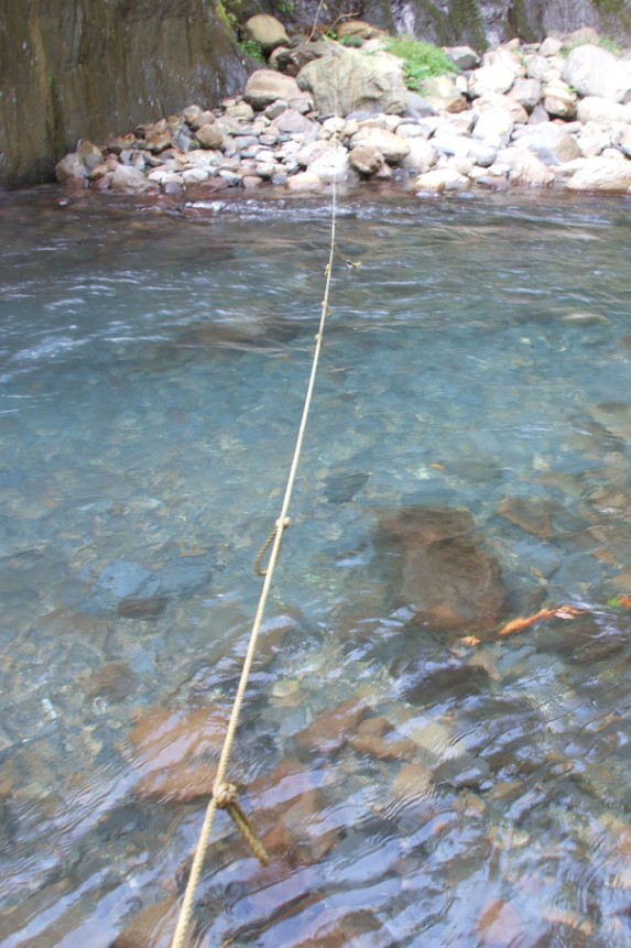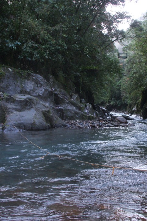 07:13~07:22 下過一段岩壁(有架繩)之後抵札孔溪谷,古老的溪谷,真正的仙境就是這裡了,麗華姐昔日所言的”烈酒”,今日搖身一變成了”甘醇可口的清酒”。寬衣解帶,黑熊大哥首先發難,過溪後只有一句話”通體舒暢”。【說明:前一天下雨,本日1/1札孔溪水位約60-80cm、大腿中段,有架繩確保,安全無虞;對岸有一處大獵寮,過溪之後請不要直接上岩坡(青苔多超滑),若水位許可請先下行至獵寮左側,再行上切,此處較平緩。右上方有流籠—很鳥的,給我錢我也不敢坐.】
