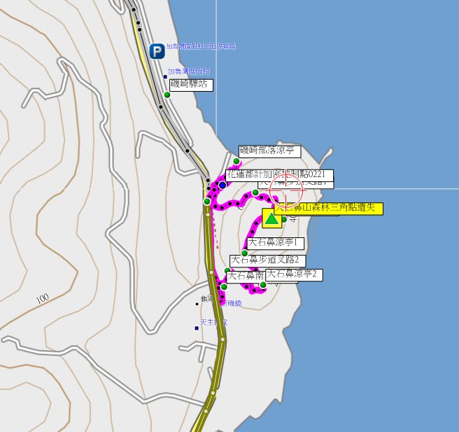 花東之旅第二天(7/15)順路去尋訪台11線旁的大石鼻山森林三角點,大石鼻山步道因崩塌封閉,由北入口走步道8分鐘抵達巨石山頭的大石鼻山,找不到森林三角點,山頂有絕佳的視野,再由南步道口出,回至磯崎部落的涼亭休息,繞一圈費時50分鐘;傍晚抵達成功鎮還有時間,又去尋訪三民國小內的南成功3-730,此點已來過多次。
