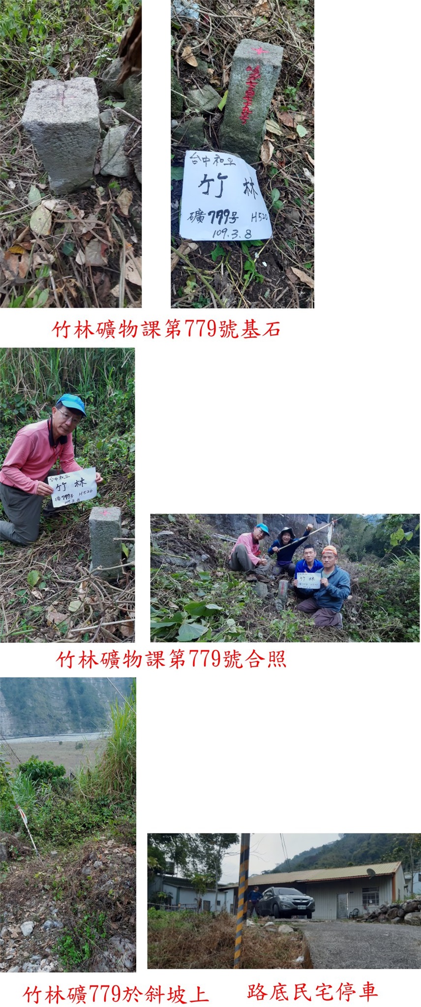路底前左側山坡地找到竹林礦物課第779號基石,前已來過2次再陪小楊來一次,以前來明顯好找,此回再來竟然長滿雜草要清理,基石剛好於鐵線下方;找完此點已近黃昏,驅車回到白布帆大橋取車,再到卓蘭市集晚餐,感謝孔孟子請客。