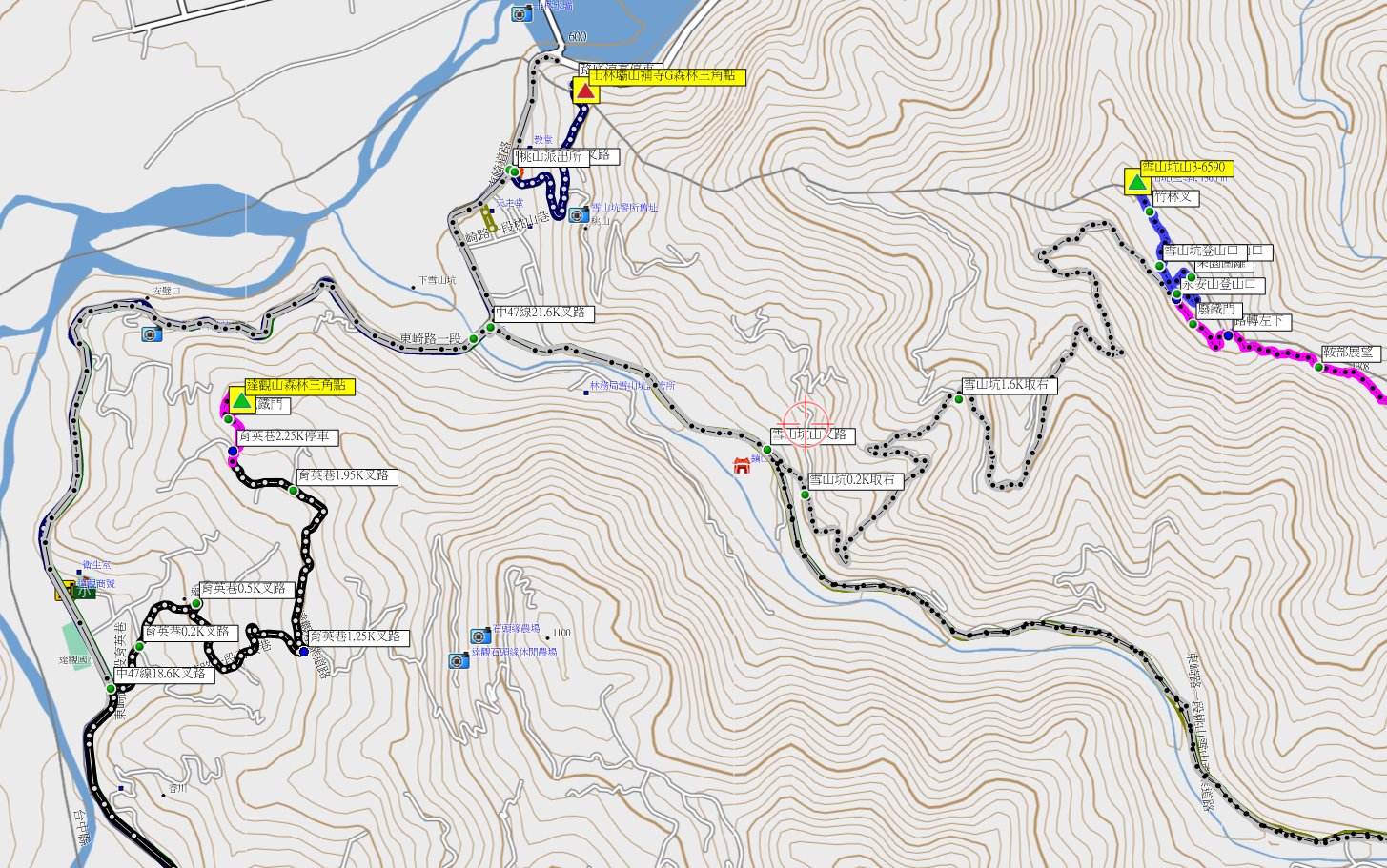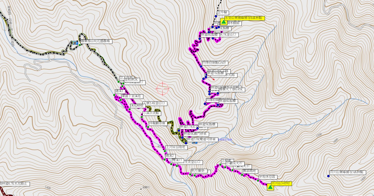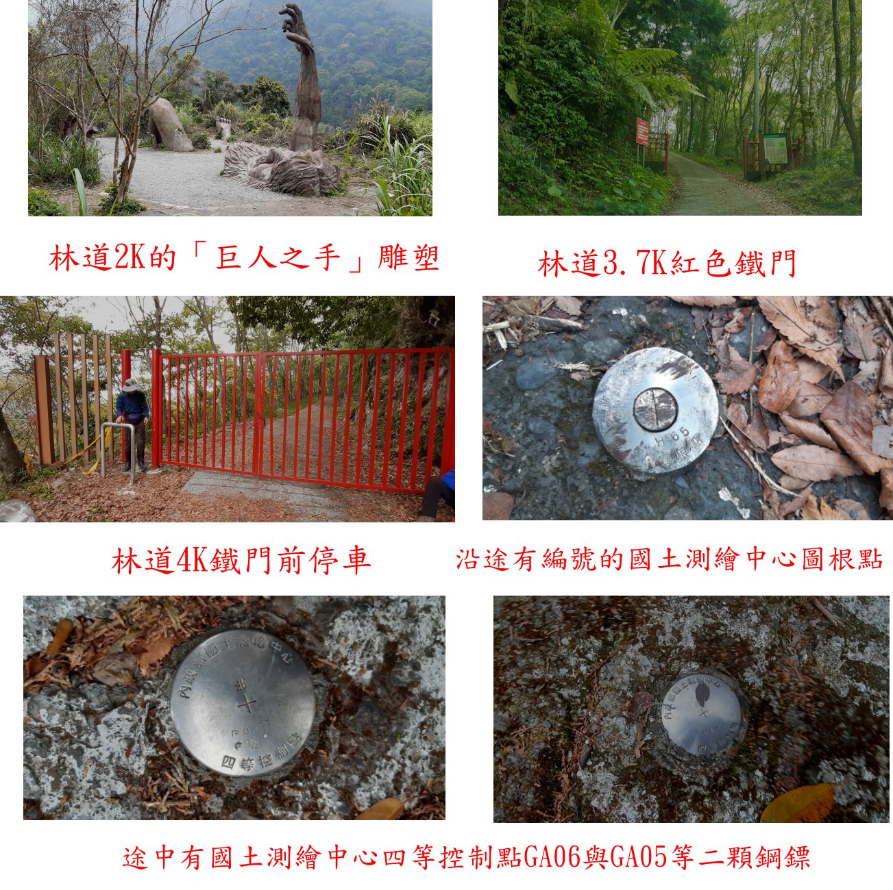 下午第3座為永安山東南峰,續行東崎路北行至雪山坑橋,右轉溪畔的產道前接到540林道,途經「巨人之手」,前行至540林道4K鐵門停車;踢水泥林道上山至8.7K沒看到山友描述的登山口,續行至8.85K找到一條舊獵徑,路況還不錯竟然直達山頂,補寺B自然石森林三角點與山字水泥柱2顆基石,係基石達人文達兄剛找到,上山走1小時又43分鐘,爬升6百餘公尺;回程跟隨師公吉兄路條,接近林道路找不到路條橫切回林道,感覺我們上山的路線較好走,此山往返費時3小時又45分鐘。