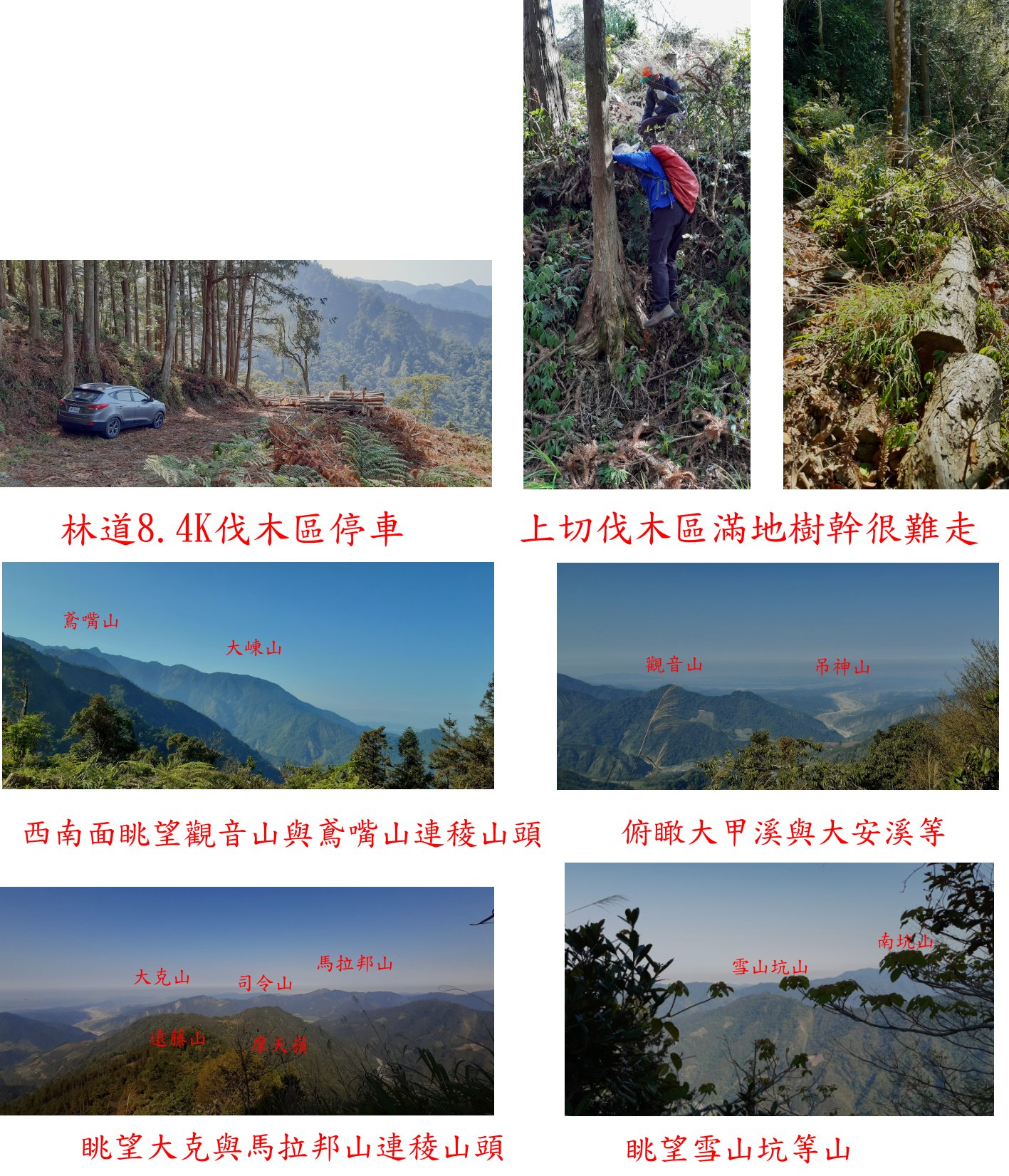 3/8約山友到台中和平地區撿幾顆新找到的基石,首先去走遠藤山東峰,至竹林部落右轉竹林產道經甜柿果園抵至林道8.4K停車,剛開始有段筏木區難走,進入樹林路況轉佳,有一芒草落差地形此處視野極佳,走38分鐘登頂,有顆補寺E自然石森林三角點,係曾老師等山友剛找到。