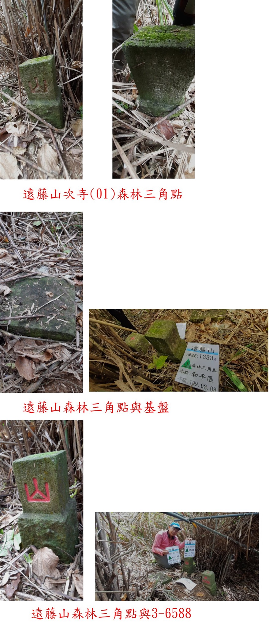 2、遠藤山:位於台中市和平區,標高1333公尺,三等三角點6588號與次寺(01)森林三角點;座標244202 2689300。