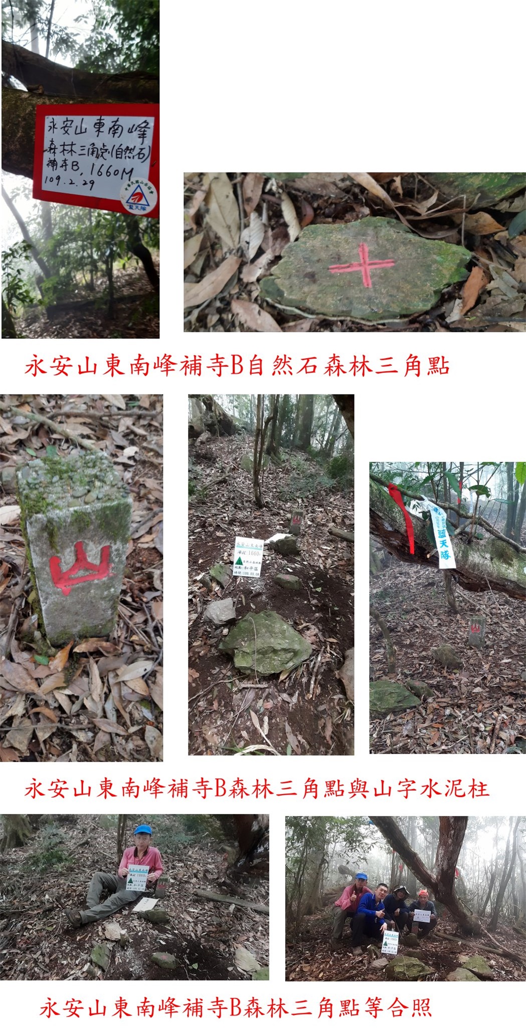 3、永安山東南峰:位於台中市和平區,標高1660公尺,補寺B自然石森林三角點與山字水泥柱;座標247915 2691148。