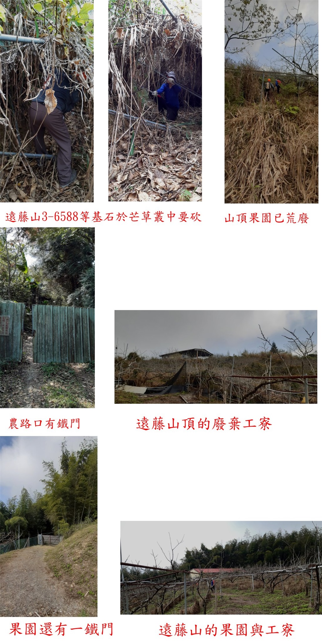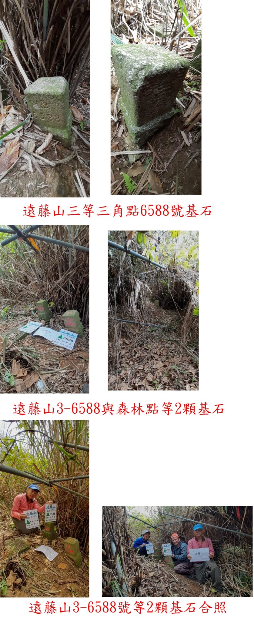 第2座為遠藤山,竹林產道回至5.7K叉路,果園農路口有鐵門,走約0.6K抵果園另一鐵門續前行至高點,山頂的果園已荒廢,於芒草中尋獲3-6588號與森林三角點等2顆基石,旁還有一基盤,花了點時間將芒草砍開拍照,此山陪小楊再度造訪,上山走19分鐘。