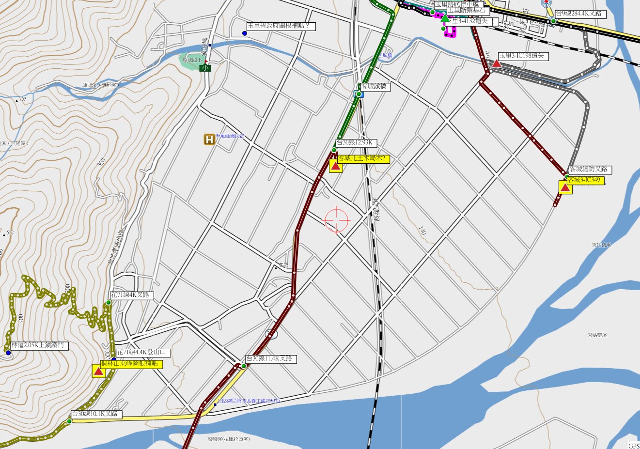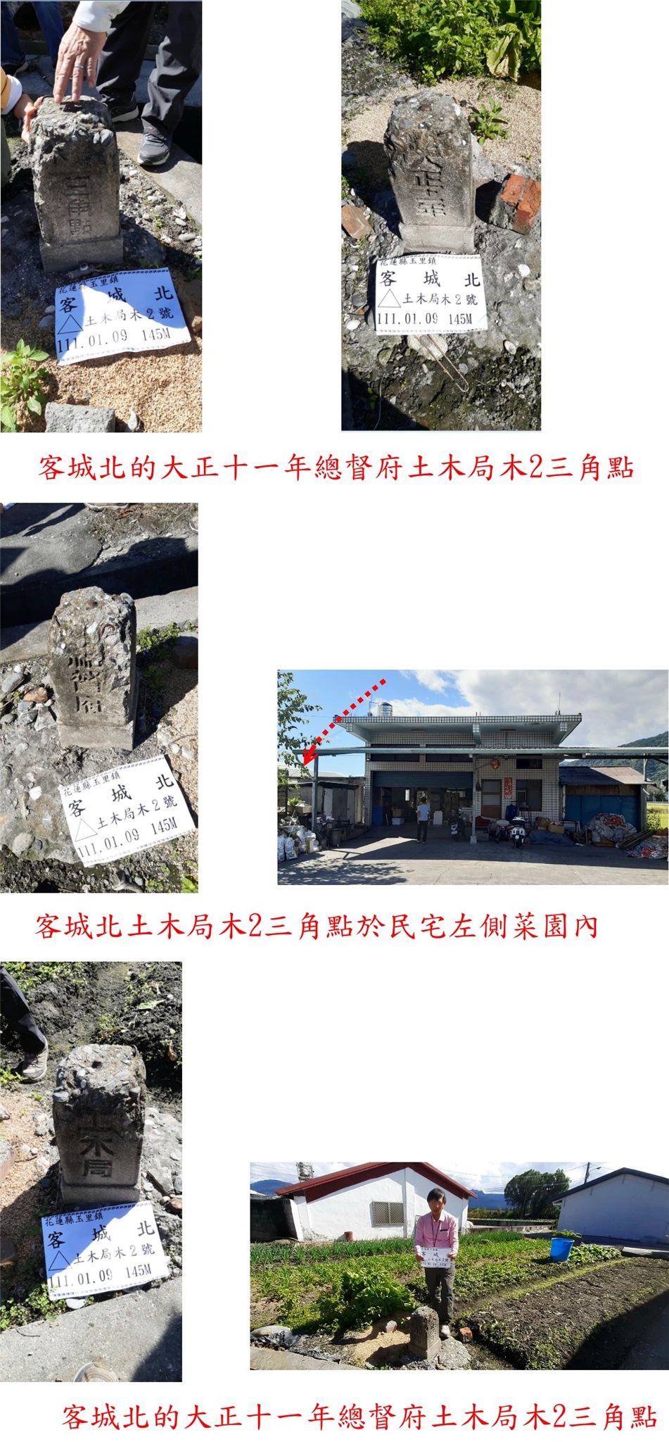 3、客城北:位於花蓮縣玉里鎮,標高145公尺,大正十一年總督府土木局木3號三角點【2更正為3】;座標280784 2579490。