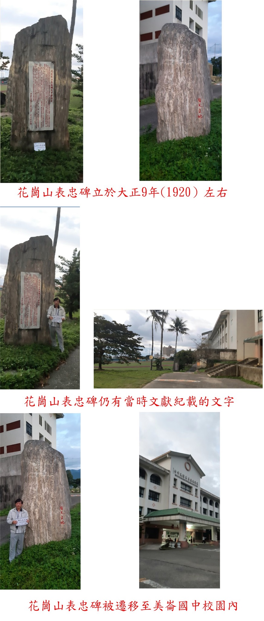 第三天(1/10)行程,清晨先去參觀花崗山表忠碑,此碑立於大正9年(1920)左右,位於花崗山公園係悼念陣亡的軍警人員,光復後改為「臺灣革命先烈紀念碑」,後被遷移至美崙國中校園內,石碑仍有當時文獻紀載的文字,趁清晨還沒上課前由中美九街校門進入校園,於學校左側操場旁找到石碑。