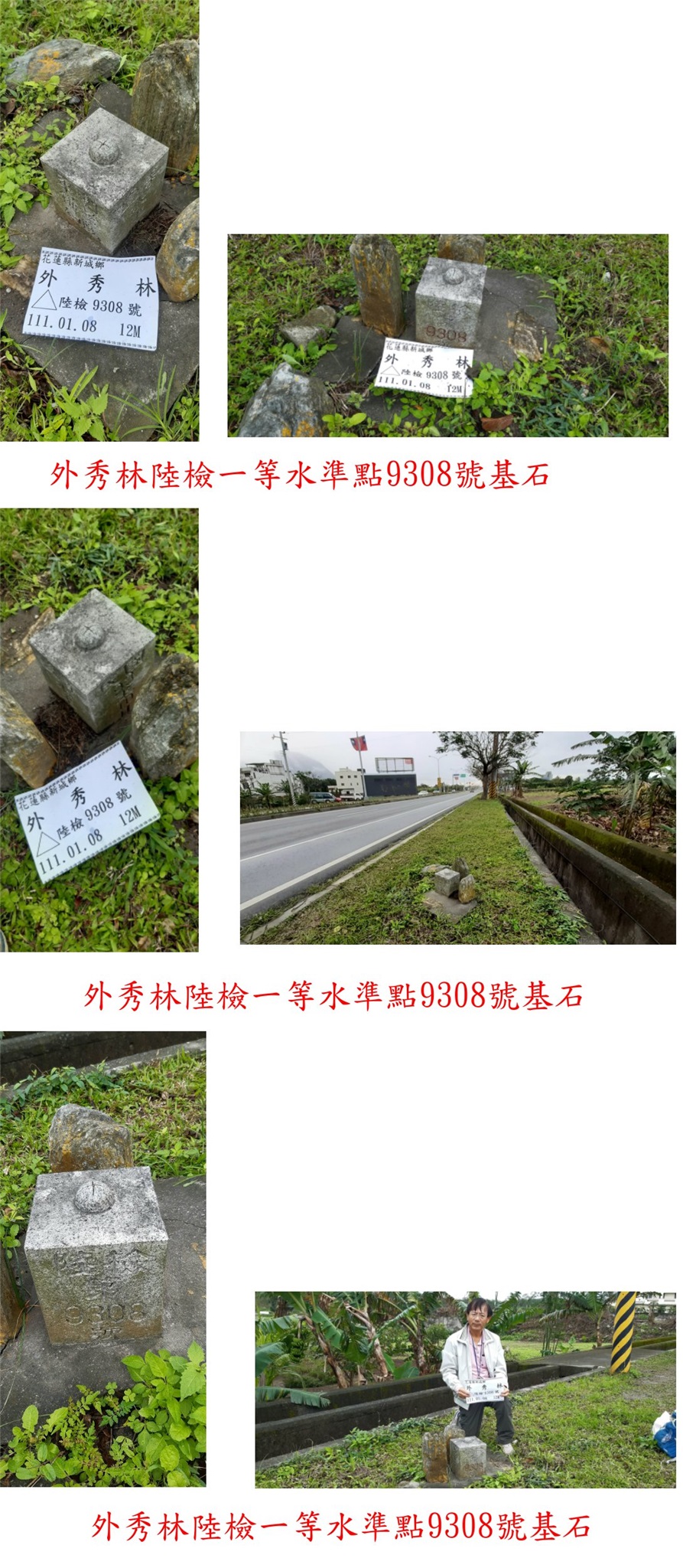 外秀林陸檢9308號一等水準點於北向的路旁,原四顆護時只剩2顆,軍備局測量隊設立於93年10月屬後期補立,此點係台東阿倫新找到的路過來補。