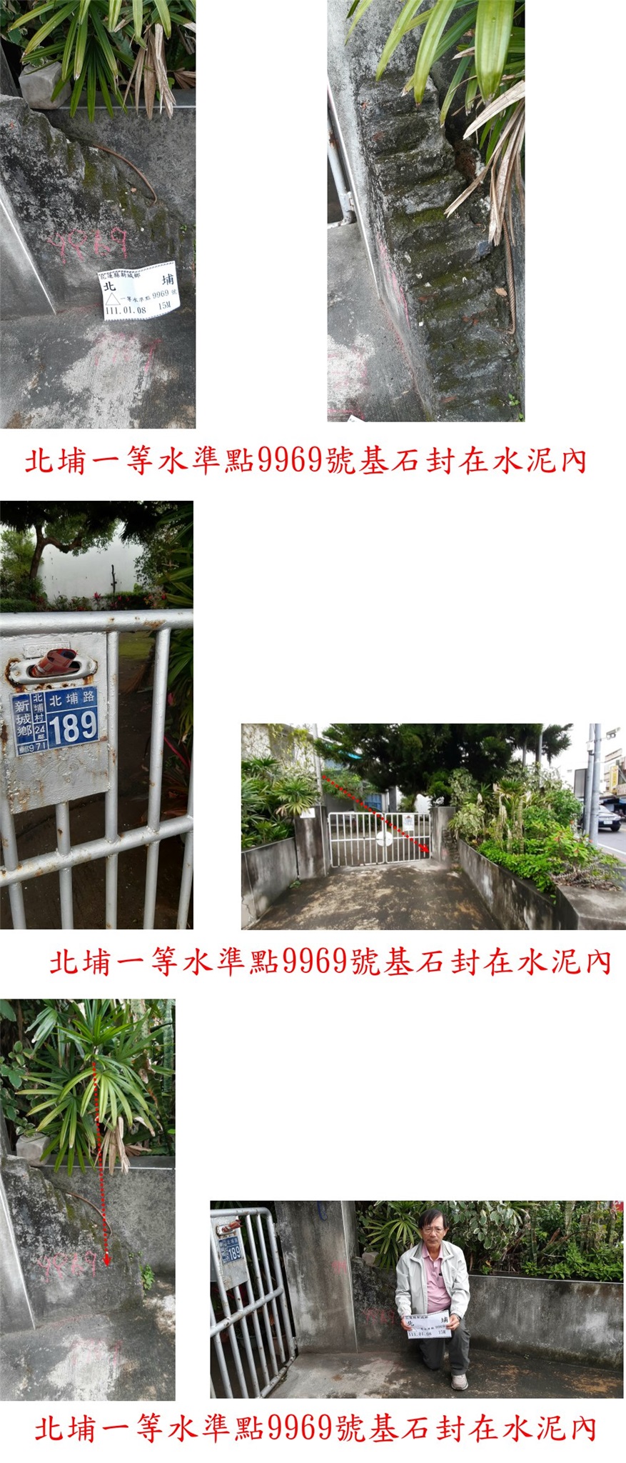 此點於民族路與北埔路叉路的189號民宅前,即北埔國小的西北方的7-11對面;北埔的一等水準點9969號基石於民宅鐵門右側,基點被封在門口右側矮橋階梯狀的水泥牆內,據說基石斷裂只剩頭部要敲開才能見到,此點係大水準點很珍貴尚待山友努力敲出移位保存,此點係7777兄新找出路過來拍照。
