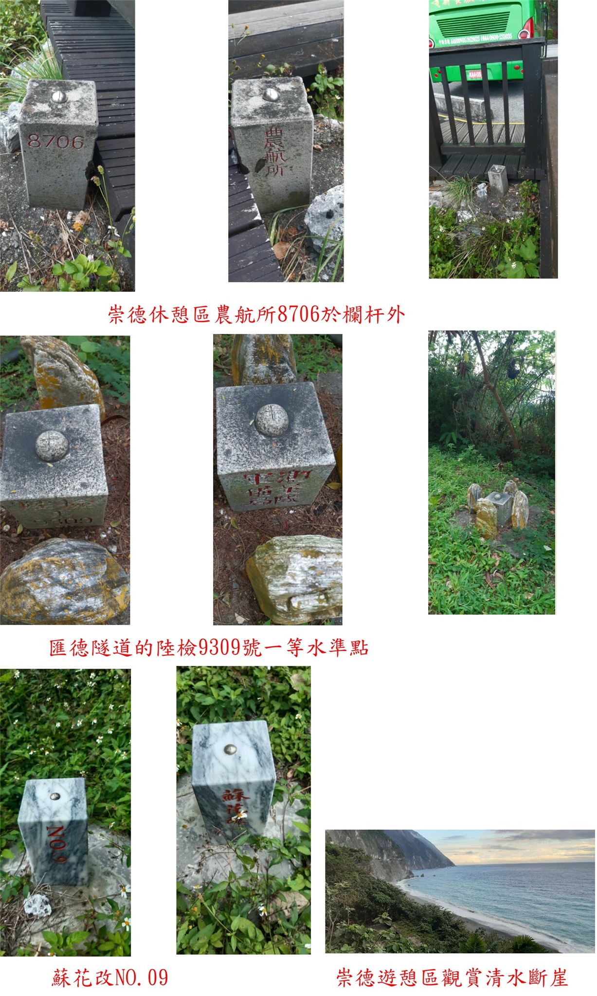 1、外秀林:位於花蓮縣新城鄉,標高12公尺,陸檢一等水準點9308號基石;座標313422 2667862。