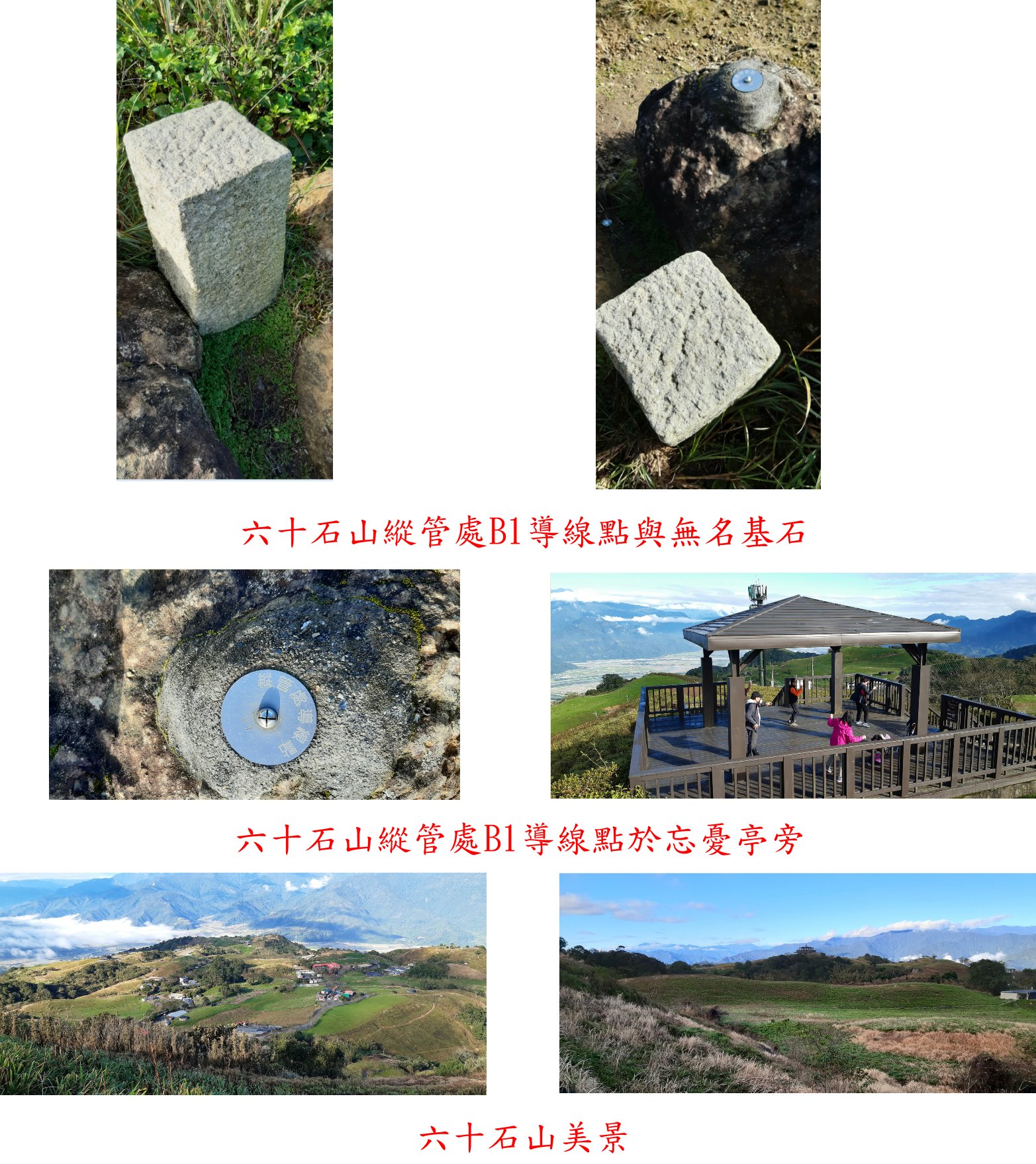 第二天(1/9)第3顆為客城北土木局木3號三角點,此點於玉里客城一間民宅旁,總督府土木局埋設於大正11年;第4顆為光復北內務局4/0,總督府內務局埋設於昭和6年,位於光復1處砂石場旁檳榔園內(於光復溪堤坊邊);另早上於六十石山最高點的忘憂亭旁,找到1顆縱管處B1導線點,旁還有顆無字的基石。