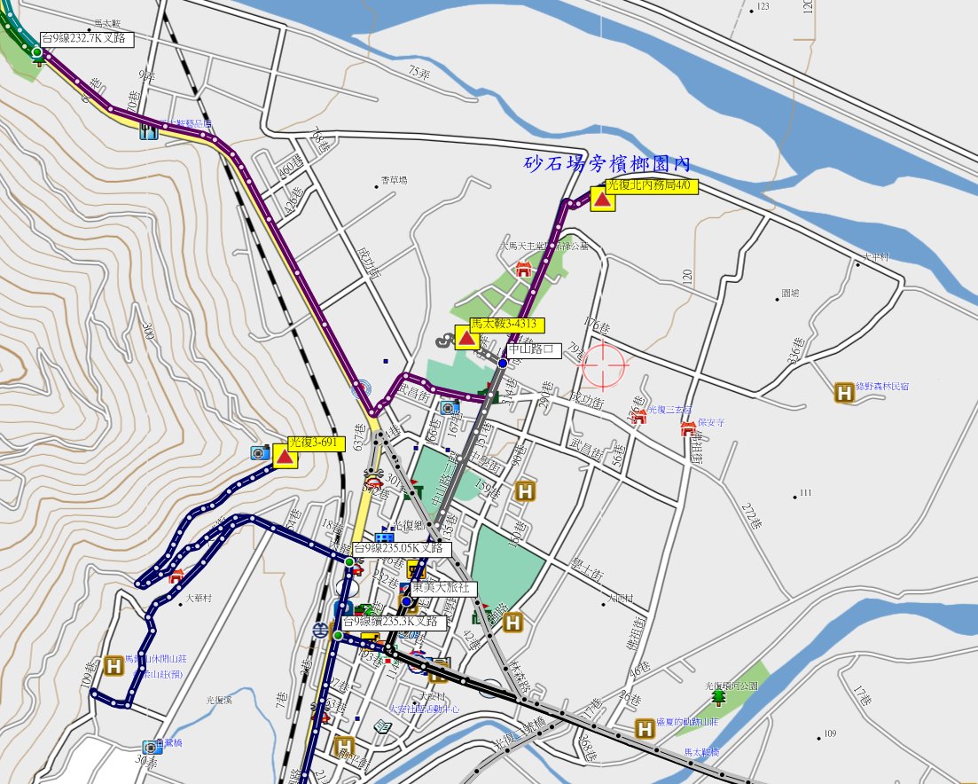 4、光復北:位於花蓮縣光復鄉,標高123公尺,昭和六年總督府內務局4/0號水準點;座標293182 2619800。