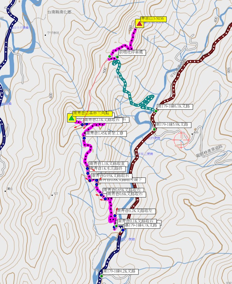 4/2早上走了嘉義的屯阿巴娜等3座山,下午來到台南的南化走南青倉山森林三角點,此山於南化水庫上游既深且遠,造訪的山友屈指可數,此行車停於南179-1線4.7K附近的農宅,走荒廢產道上山叉路頗多,產道已接近山頂,路況尚稱乾淨好走只有接近山頂時要砍,走1小時登頂基石躲在倒木下方;此山往返走了4.6K,累計爬升280公尺,往返費時2小時15分鐘。