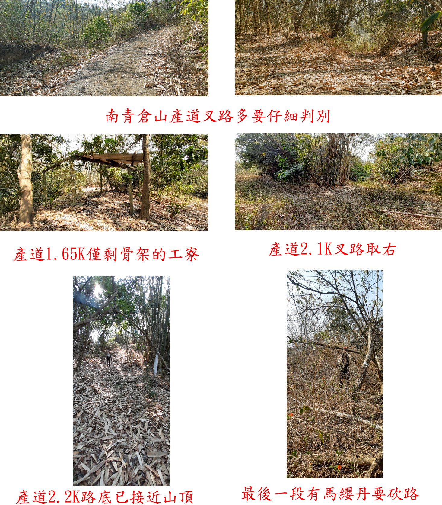 由民宅右側走產道(0.1K處)上山走尚能通行小發財車的小水泥路至0.2K叉路,路面積滿很厚的竹葉走來很滑小心翼翼,此山造訪的山友極少無航跡顆可用叉路僅能自行判斷,偶見找路人老舊特殊的路條;0.2K叉路取左水泥路至0.6K與0.65K叉路,2個叉路均取右行至0.8K叉路,取左下坡路的產道行隨即有一工寮停有農用車,前行至1K水泥路終,再來產道荒廢已難行車;土路續行至1.1K叉路,右後產道不取,取直產道經1.65K僅剩骨架的工寮,廢產道大轉彎緩上至2.05K叉路,鞍部順稜行可通往青倉山3-5036,取右續行至2.1K叉路;取右續行至2.2K路底已接近山頂,進入樹林最後一段約