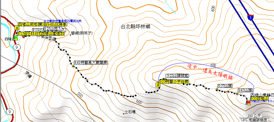 07/16登頂坪林四堵山後,回程從三角點處到柯藝小平台牌途中----遺失一付太陽眼鏡(位置如圖)