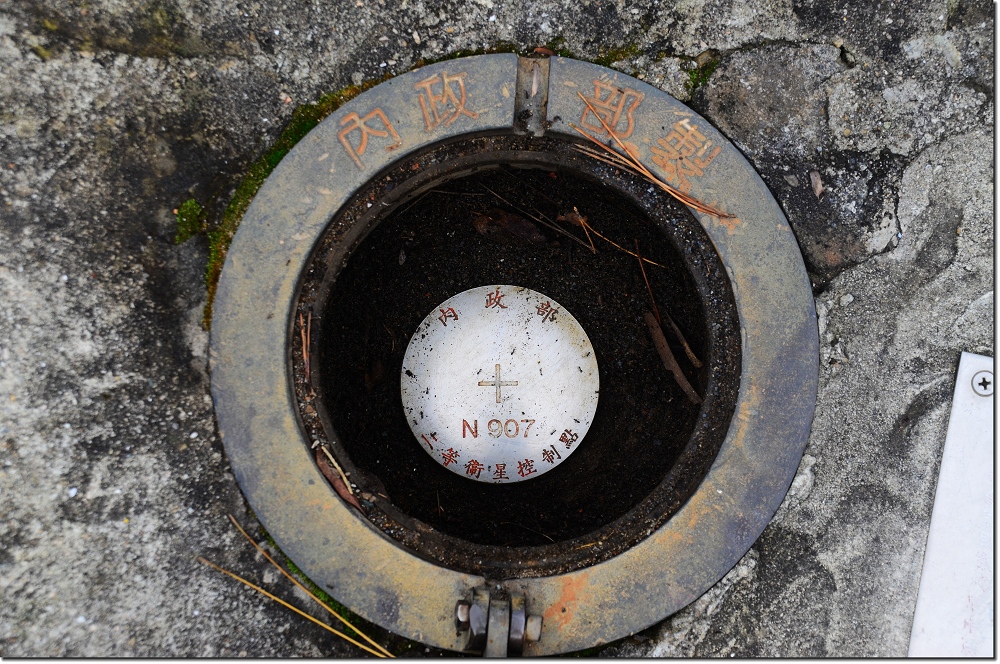 取右階梯步道上行,約3分鐘抵達公園最高點,山頂有尊大觀音像與龍首龜身的龍龜,一等天文點位於龍龜後方,觀音之前,有顆水泥造的大基點,據說編號710號的三等三角點被包覆於此大水泥四方柱之內;旁邊地面另有一顆內政部二等衛星N907控制點。-------------------------------------------------------------------------------------------------------