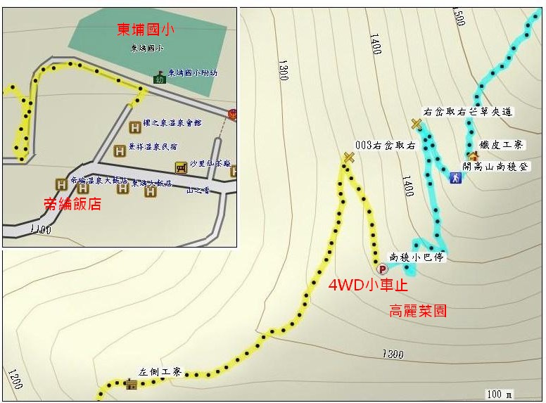 1732從登山口起再走約400公尺,抵達小巴停車處(241856 2607166),高度約1380公尺。