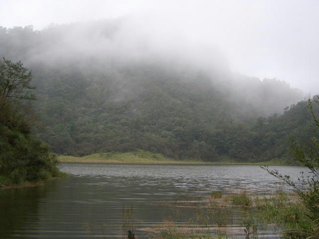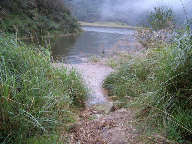以現在的水位,人只能站在下松蘿湖的斜坡小路上,湖邊空地都不見了,根本沒地方搭帳篷。 要去南勢溪,必須由山坡上鑽過沒人走過的芒草,本來也是想去南勢溪,但是芒草高又密還是放棄。