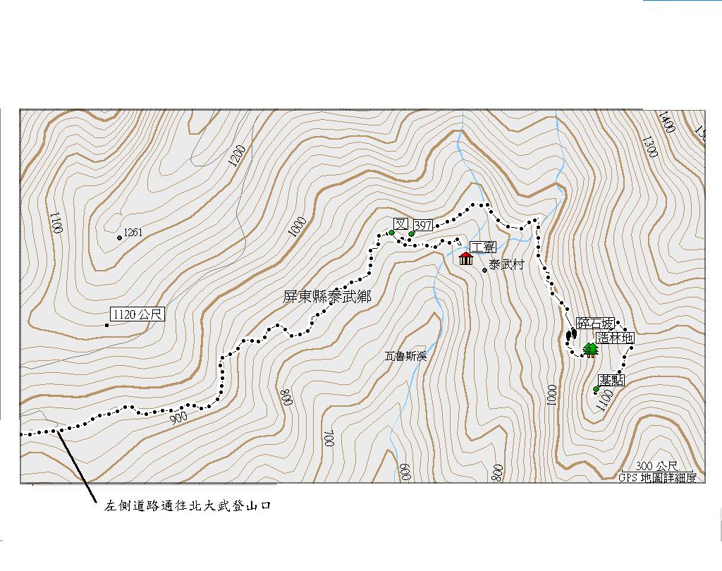簡單敘述一下登山路徑,舊地質圖中自庫瓦魯斯社出發向東有條路一直通到南北大武山的最低鞍,登山口之後的山腰造林小路和這百年前的舊路大致相同,道路離開通往北大武山登山口的叉路口後不遠水泥路坍方,機車可以再走一段之後會看到一處叉路,探路的結果下面那條會通往開墾地工寮,上面那條才是正確的路,機車可再行約100公尺但路況不好車輛停在叉路口即可,順廢棄產業道路還能走數百公尺到第一條溪為止,路旁開始出現櫸木造林地,過溪後路跡不明要仔細找,路旁有廢棄流籠鋼纜,爬坡至稜線上造林地有左向叉路勿取再下行至第二溪流,過溪點還是很不明顯,這條路已經有段時間沒人走了,腰繞舊路不但濕滑又易踩空需保持戒慎恐懼的心情,忽然間前方路跡被光滑岩壁阻斷不要冒險渡過而是選擇高繞,在此綁了一條繩子輔助小心通過,之後路跡再現但不太明顯,渡過一處崩坍地後進入紅檜造林地,這是新的造林方法先保留原先的闊葉林等紅檜長大後再砍除,朝東北緩坡爬升紅檜樹苗尚小,接近標高1200公尺時要腰繞接主稜線,接上稜線有舊路跡一直通到基點,最後的小鞍部僅十幾公尺深有一小段瘦岩稜,登頂前遠遠就看到基點,沒想到期待中的森林三角點沒出現竟然由一顆省政府圖根補點取代,過基點後再行20公尺稍低處有一根保安林水泥柱,這座山雖然只是稜線的小突起但視野不錯別有一番味道,此外提一件怪怪的事,在基點處使用指北針時南北相反履試不爽,用GPS的電子羅盤好像也有問題,但是回家後指北針卻好好的,下次有隊伍來時請測試一下指北針,若該地含有大量鐵礦會讓指北針亂指。