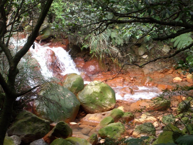 12:12取右過橋,有標示牌大孔尾步道2km、南勢湖步道3km、金山觀景坪800m,下方溪水為乳白色、溪床則為鐵褐色。